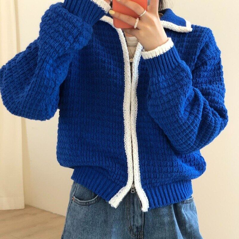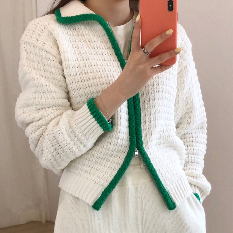 ノミクマコントラストカラージッパーターンダウンカラーカーディガンセーター2021秋冬長袖レディースニットコート6Z808 ロング オータム 秋物 ウィンター 冬物 kor19135081166