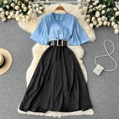 のみくまヒットカラーパッチワークワンピースサマーバットウィング半袖VネックVestidosベルトスリムウエストウーマンワンピース ショート ハーフスリーブ 夏物 ドレス ハーネス kor70582441629