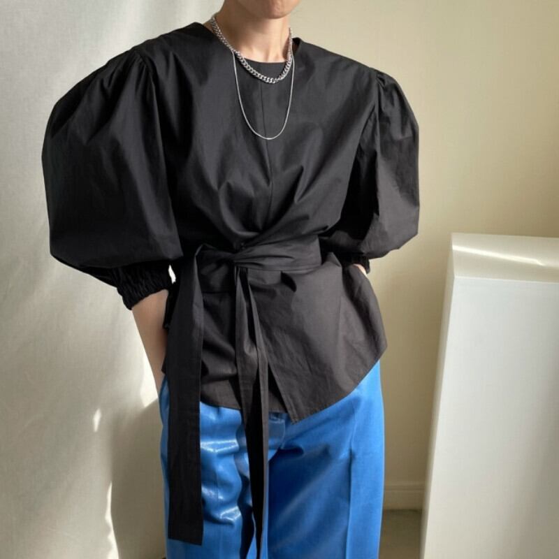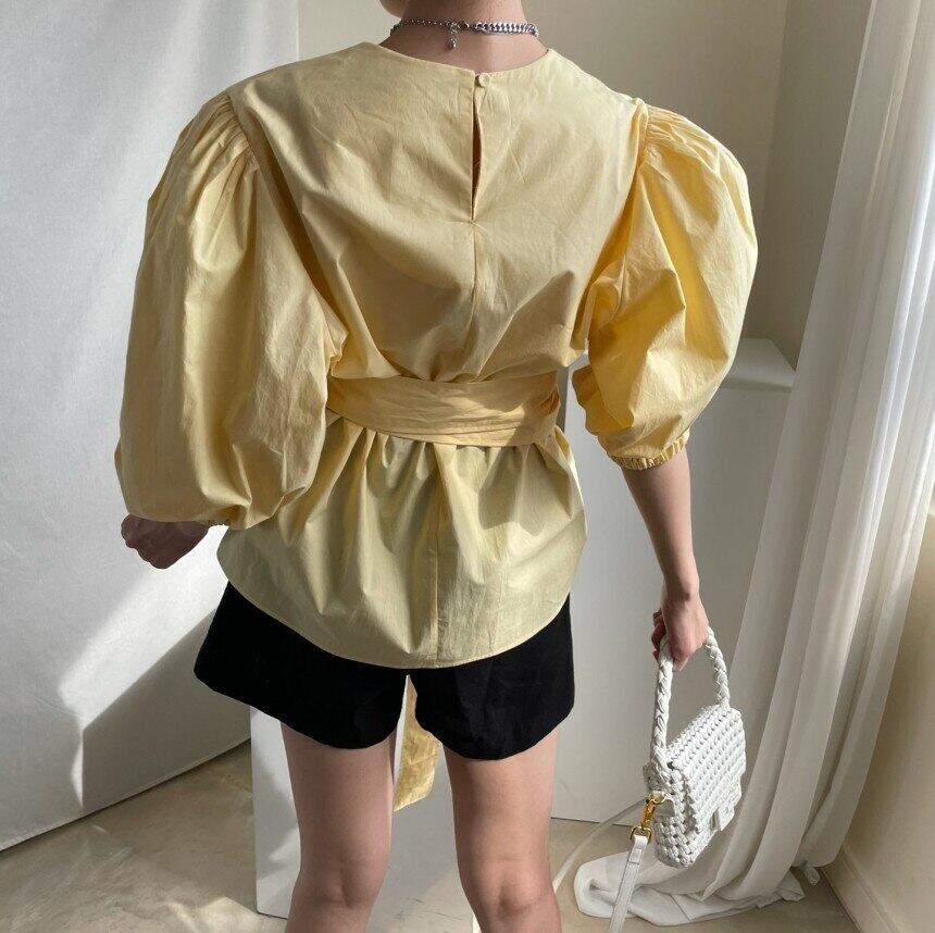 ノミクマレディースブラウスシックパフスリーブOネック無地シャツ2021サマーベルトスリムウエストブルーサ6H845 夏物 ハーネス ソリッドカラー kor12584041169