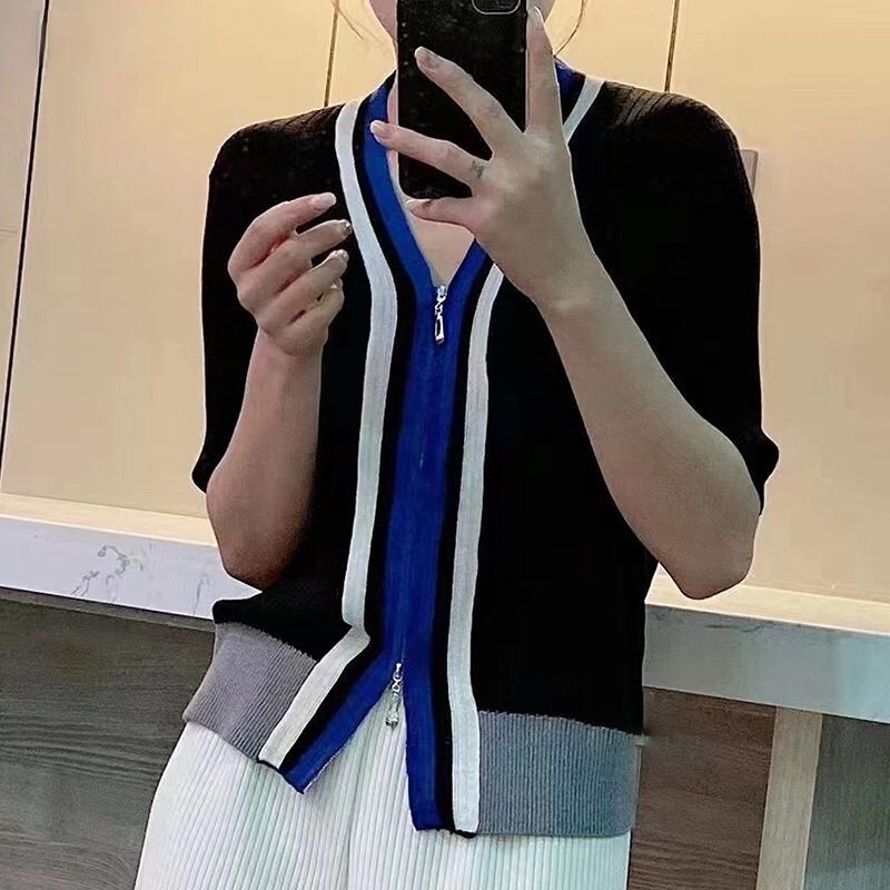 ノミクマコントラストカラーニットカーディガンカジュアルダブルジッパー半袖Vネックセーターコート2022サマーニット ショート ハーフスリーブ 夏物 kor442650915