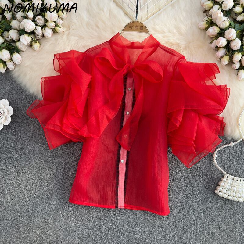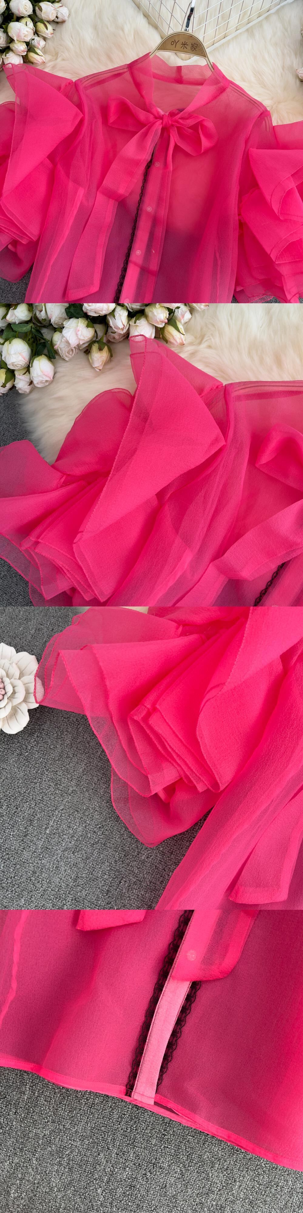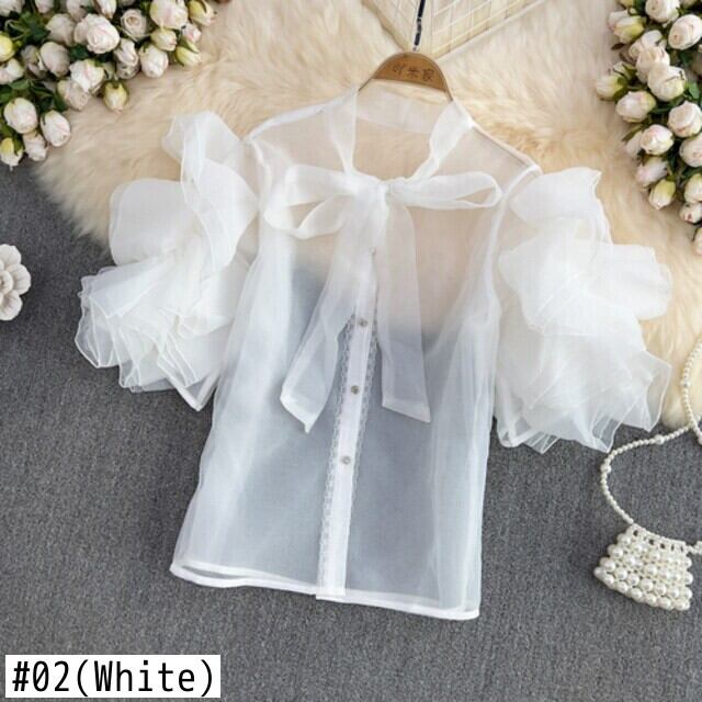 のみくまスウィートボウネクタイVネックウーマンシフォンブラウスシックバタフライスリーブシャツ2022夏フェミニマ リボン 大人ガーリー キュート カジュアル サマー 夏物 kor74798548604