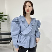 のみくまスウィートパフスリーブウーマンドールシャツフリルクロスVネックコーザルブラウス2022春レースアップシックフェミニモス 大人ガーリー キュート カジュアル スプリング 春物 kor34219320318