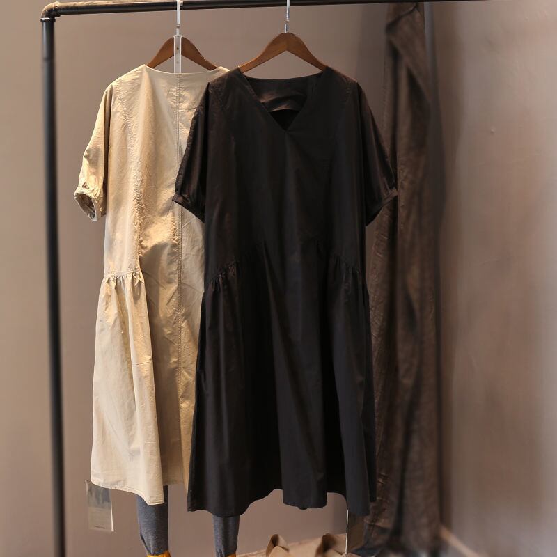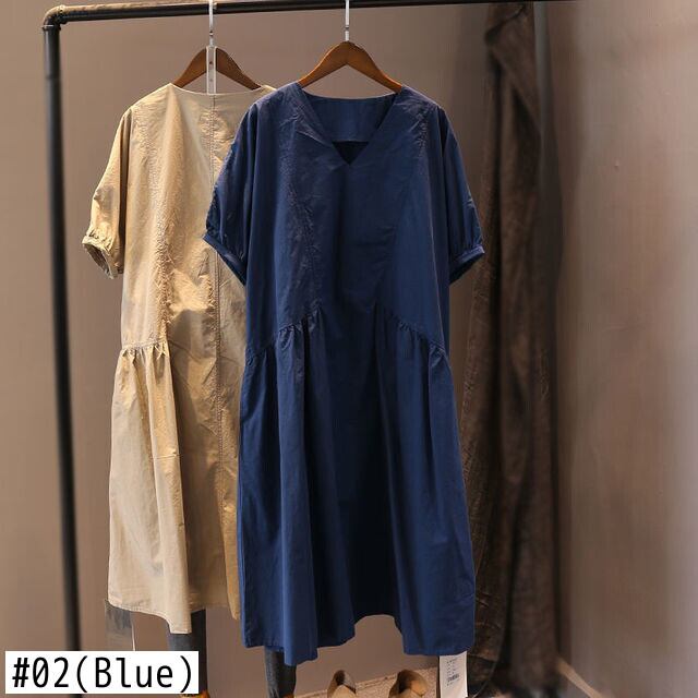 のみくまカジュアル半袖Vネックワンピース女性2022サマードレスルーズフォールドパッチワークヴェスティドス ショート ハーフスリーブ 夏物 kor71769343985