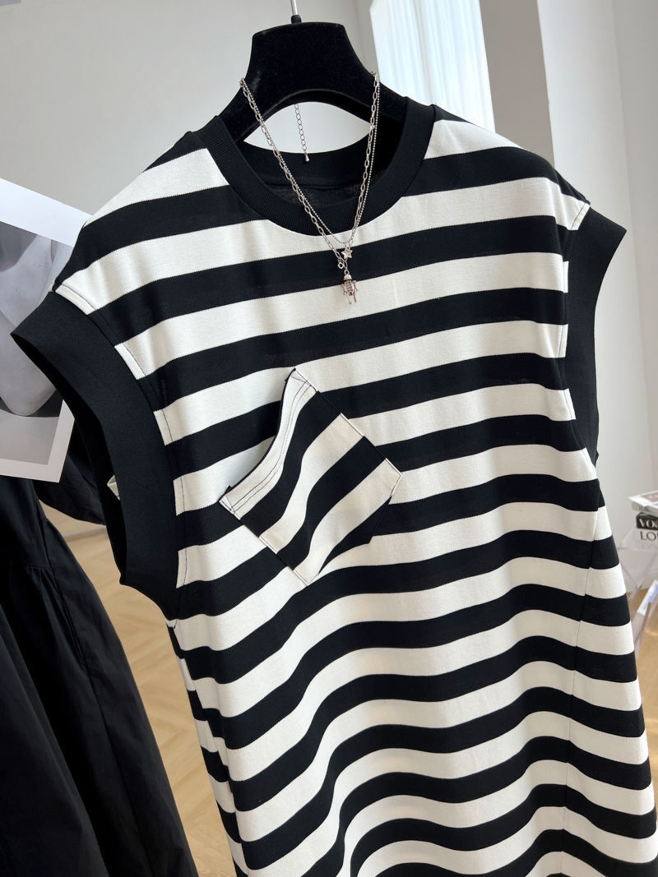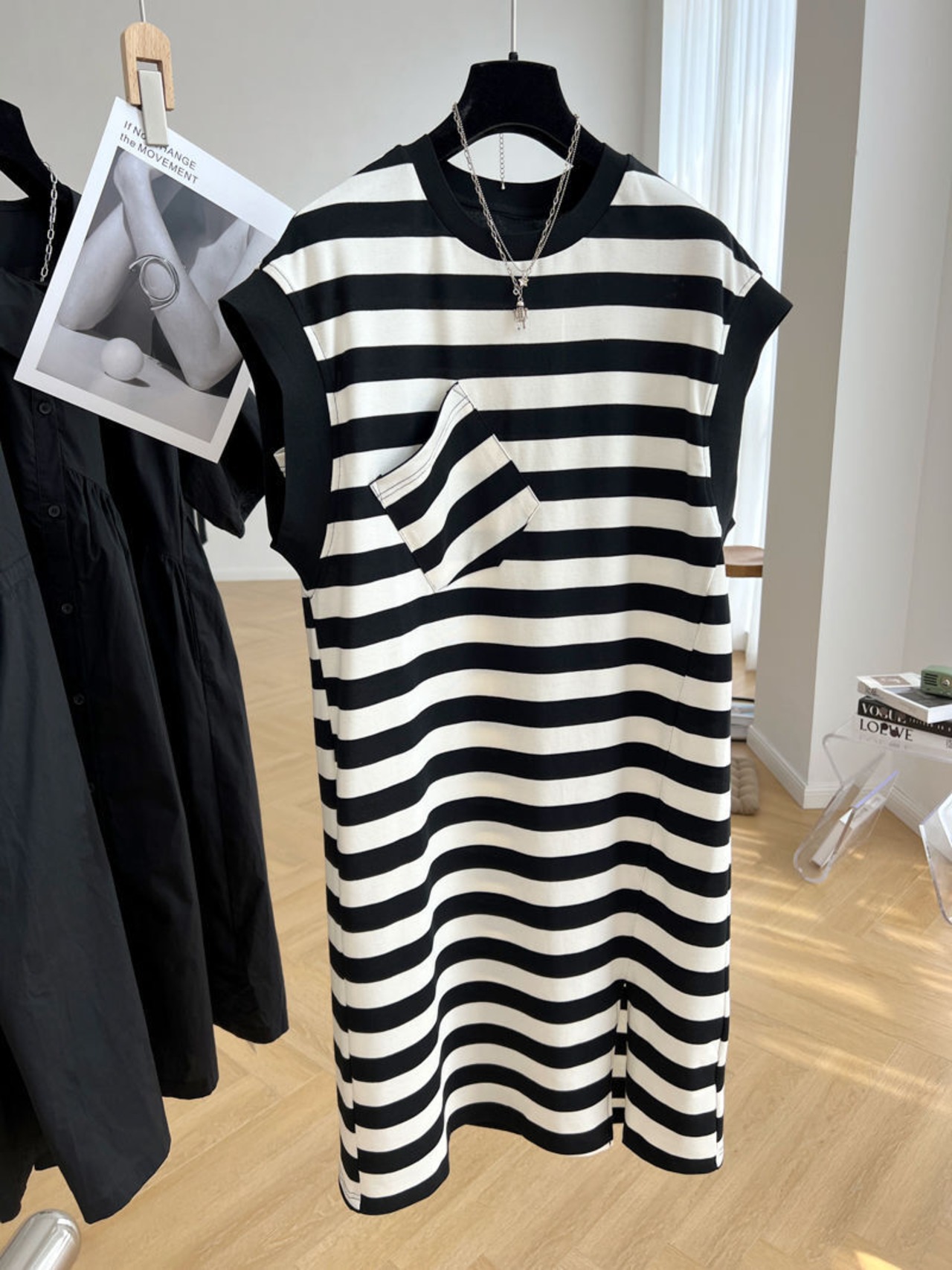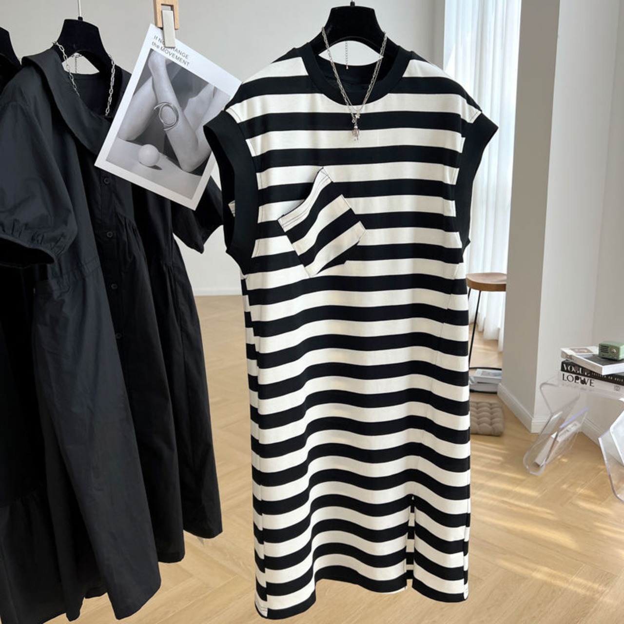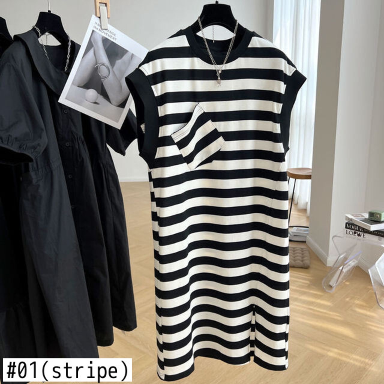 のみくまストライプノースリーブOネックワンピース2022サマーカジュアルポケットヴェスティドスストレートワンピース 夏物 ドレス kor53872205714