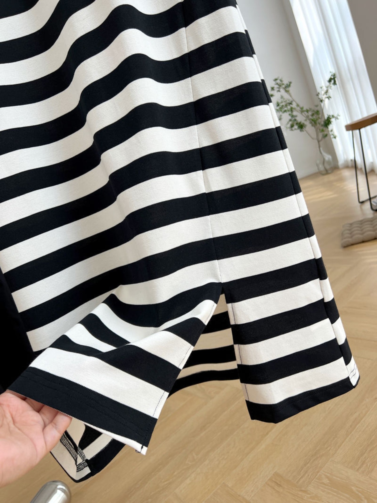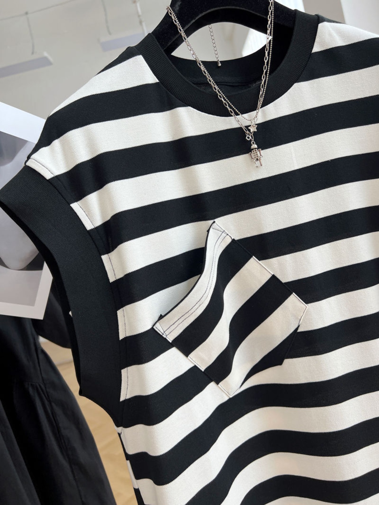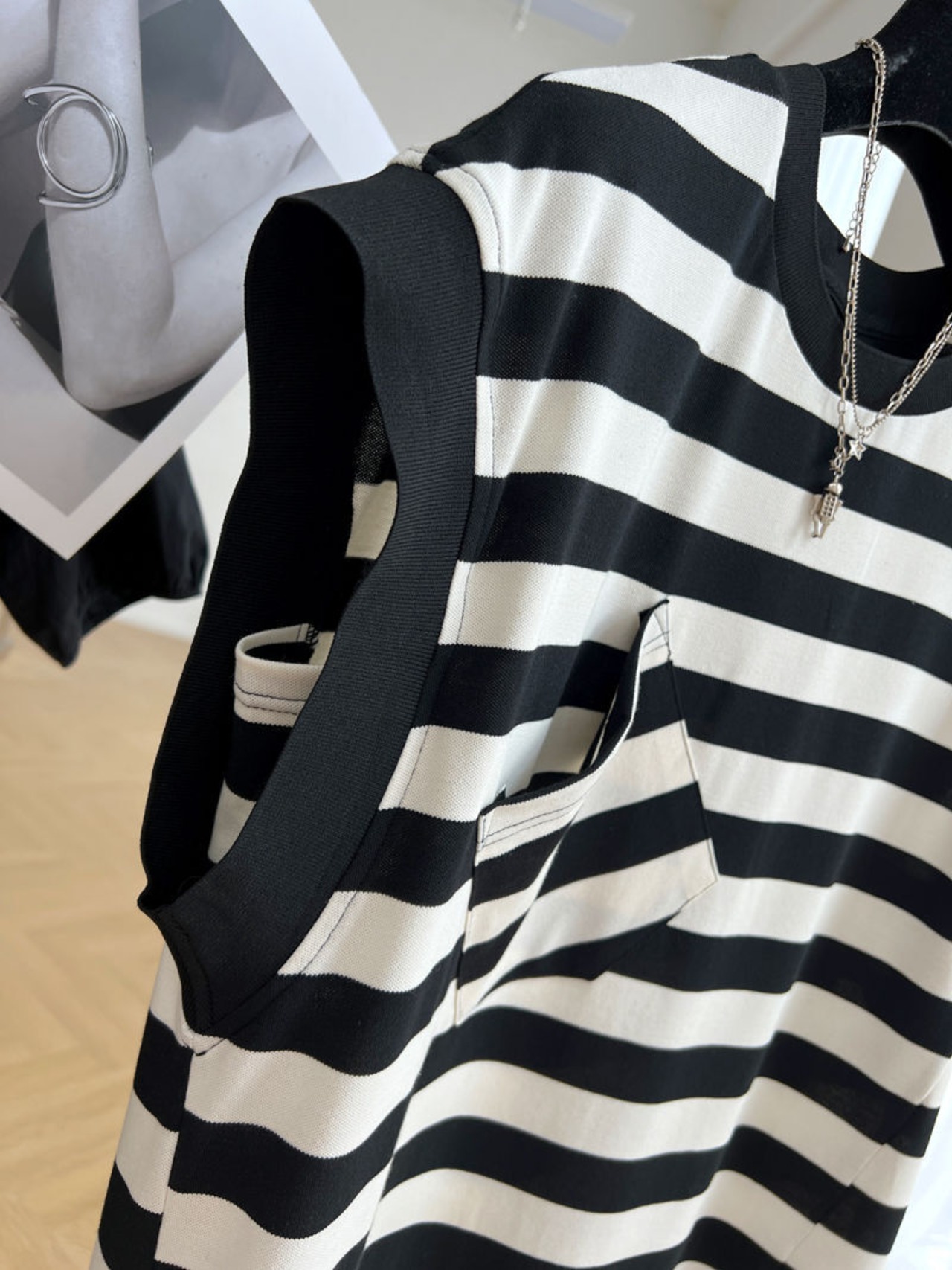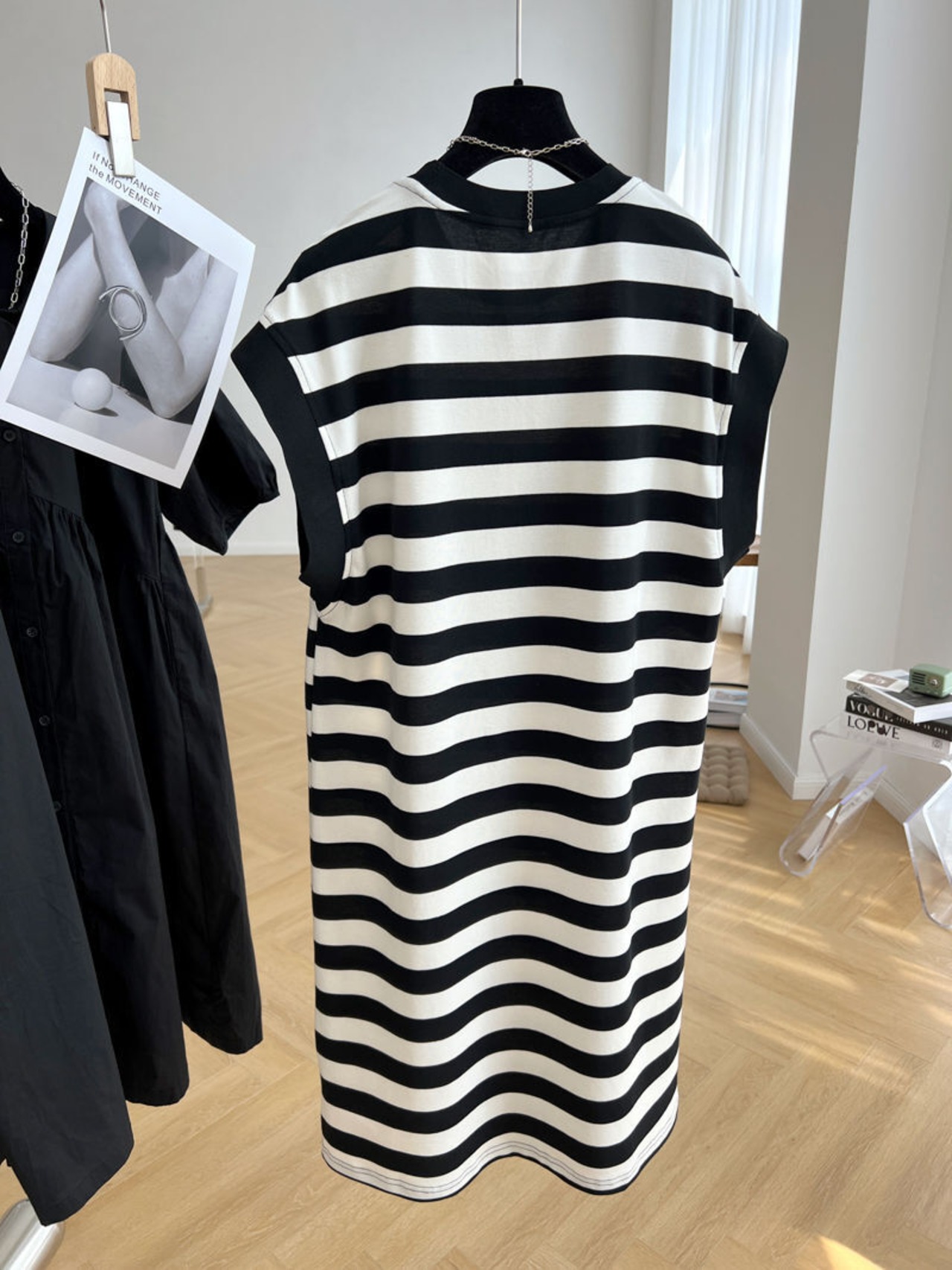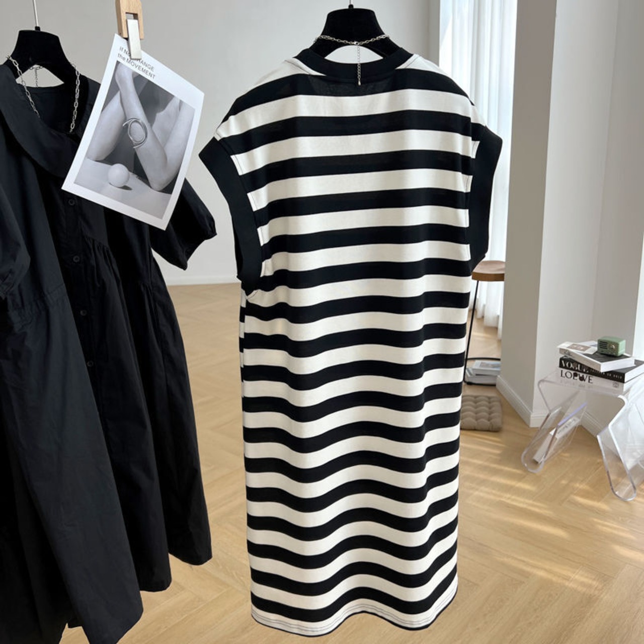 のみくまストライプノースリーブOネックワンピース2022サマーカジュアルポケットヴェスティドスストレートワンピース 夏物 ドレス kor53872205714