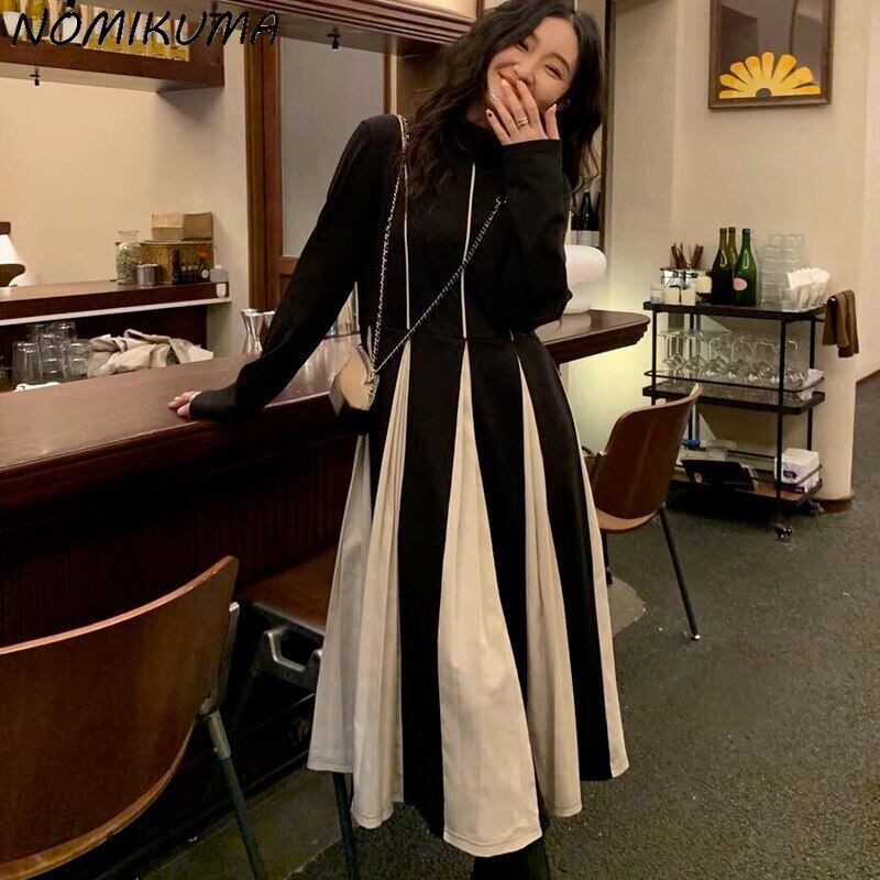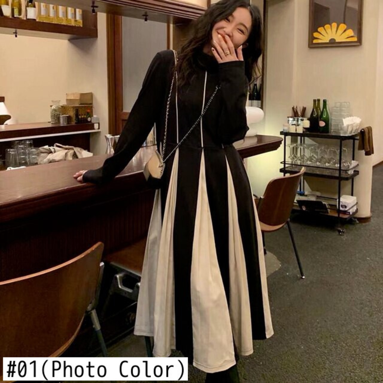 のみくまコントラストカラーウーマンドレス長袖タートルネック春秋カジュアルAラインワンピース ロング スプリング 春物 オータム 秋物 kor12901998469
