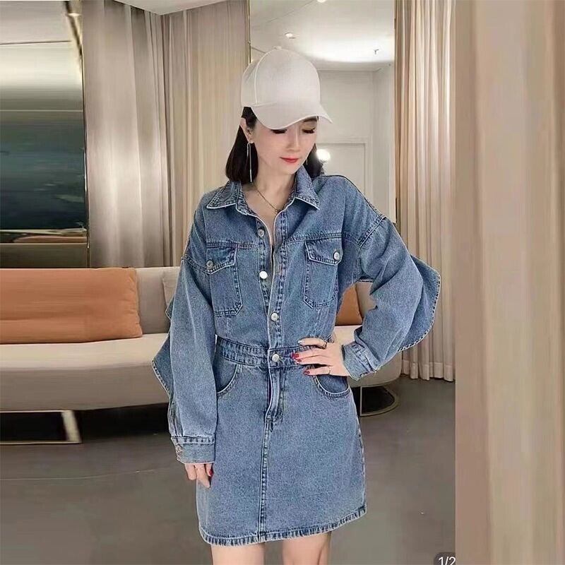 ウエストデミンドレスシックなバックフリルパッチワークジーンズ女性ドレス長袖Vestidos ロング kor1076334578