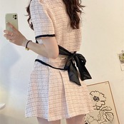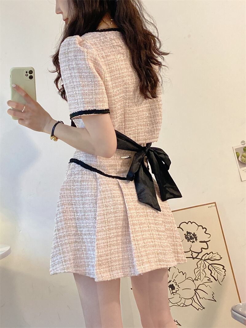 ノミクマスウィートツーピースレディースセットシックボウノットパフスリーブOネックショートトップス+ウエストAラインミニスカート2022 リボン 大人ガーリー キュート カジュアル kor85203721285