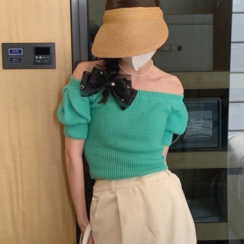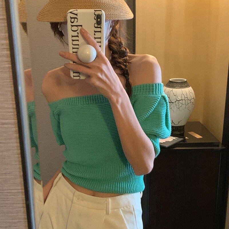 のみくまシックパフスリーブEoffショルダーニットセーター女性2022年夏プルオーバーニットカジュアルソリッドショートニットトップス サマー 夏物 オフショルダー ソリッドカラー kor42520817032