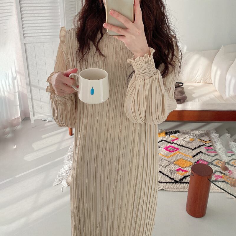 のみくまプリーツストレートレディースドレスランタン長袖スタンドネック春ドレス6E093。 ロング スプリング 春物 kor62652499982