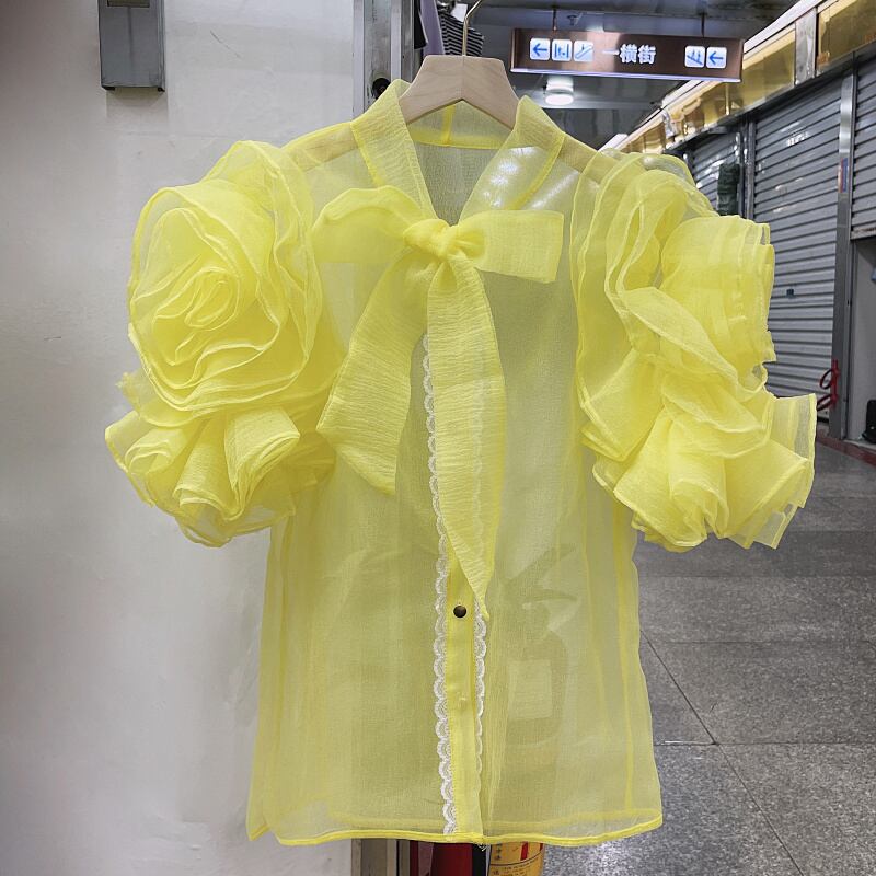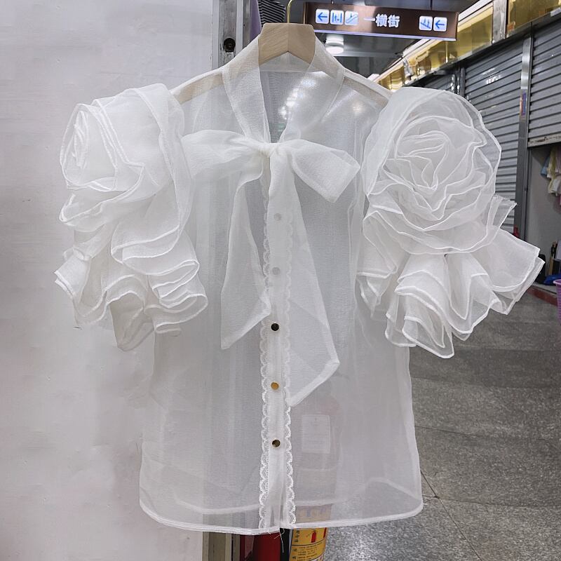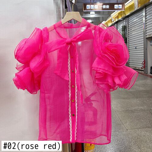 のみくま2022夏3DフラワーフリルパースペクティブシャツレディースシックボウバンデージVネックシャツトップス リボン サマー 夏物 フラワーデザイン kor20178732844
