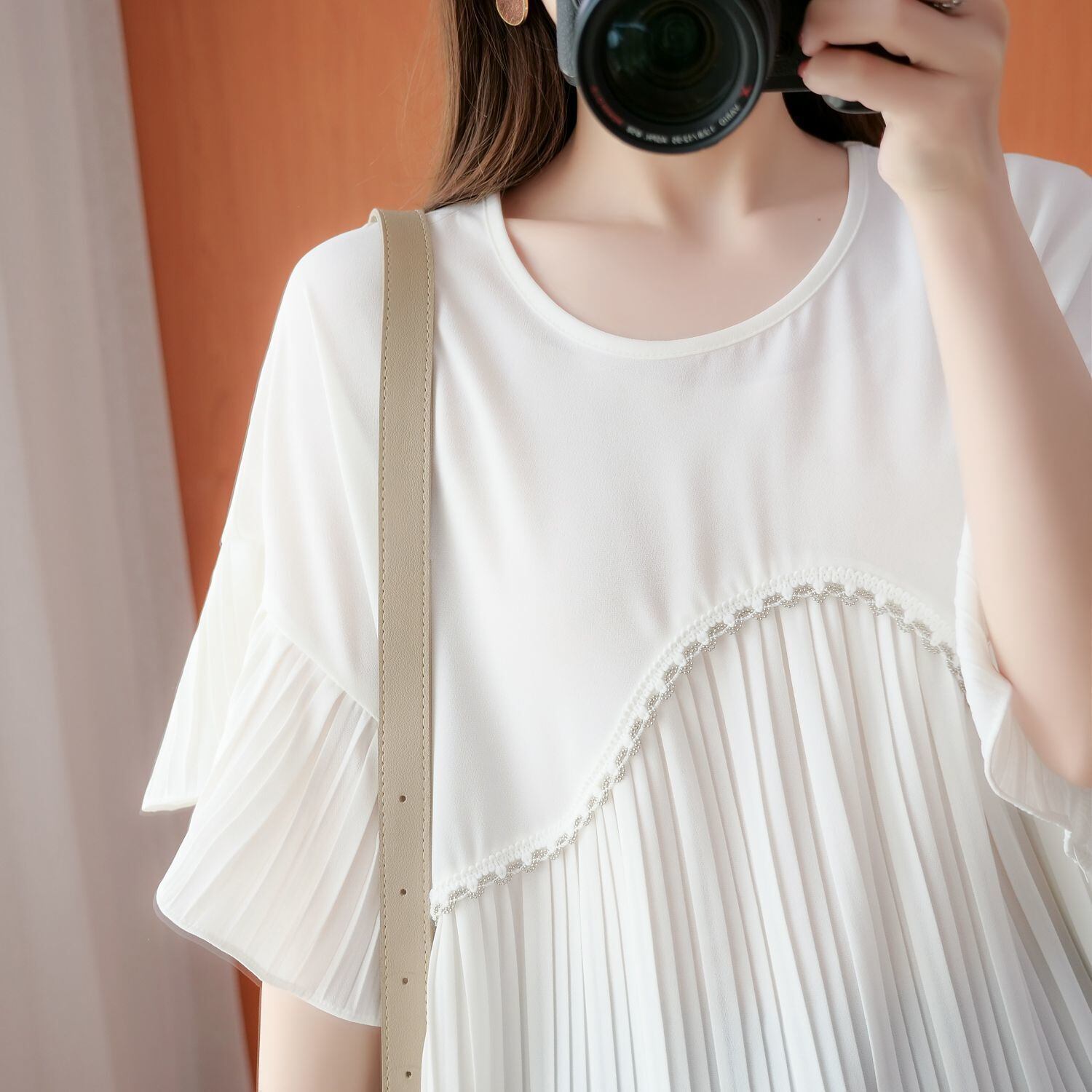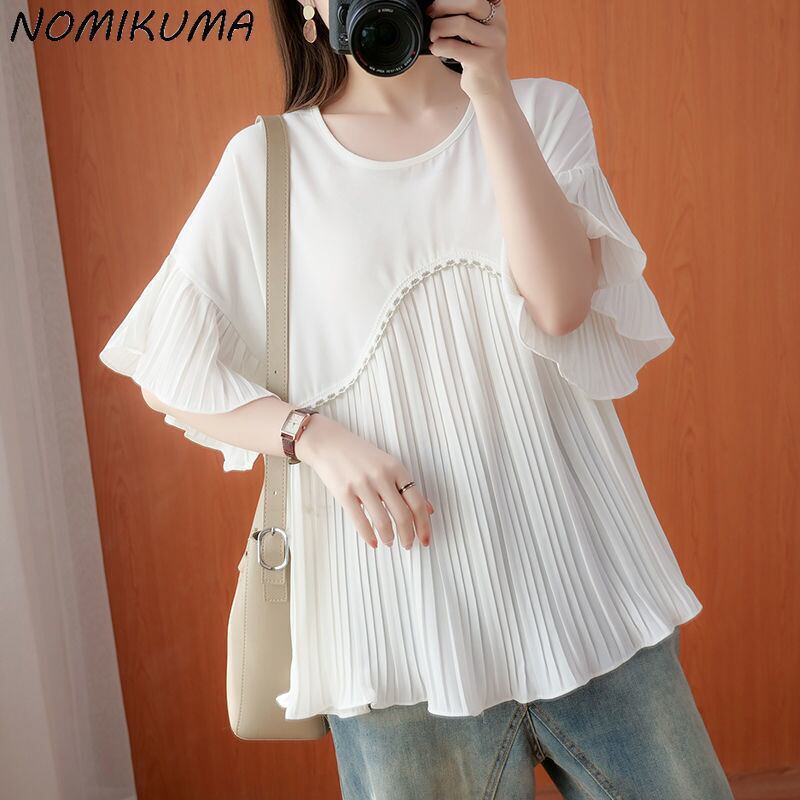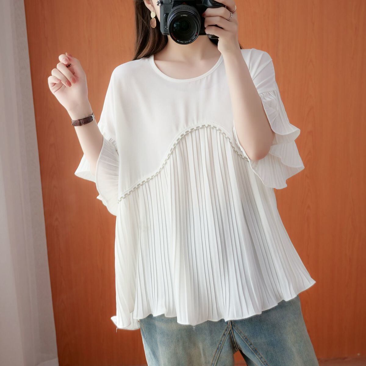 のみくまカジュアルシフォンパッチワーク半袖レディーストップ2022サマーフレアスリーブブラウススタイルシャツ ショート ハーフスリーブ 夏物 kor32803304102