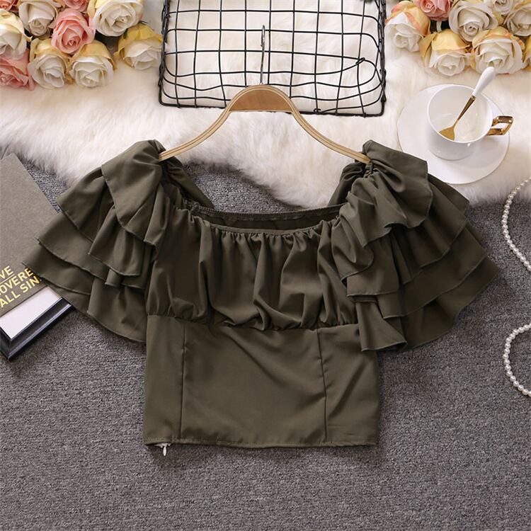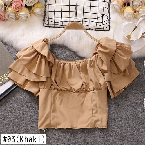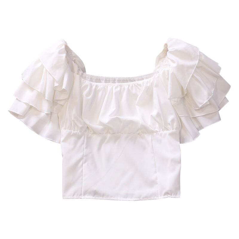 ノミクマシックスクエアカラーレディーストップレイヤードフリルパフスリーブブラウス2022サマーウエストスリムショート 夏物 スクウェア kor59466570597