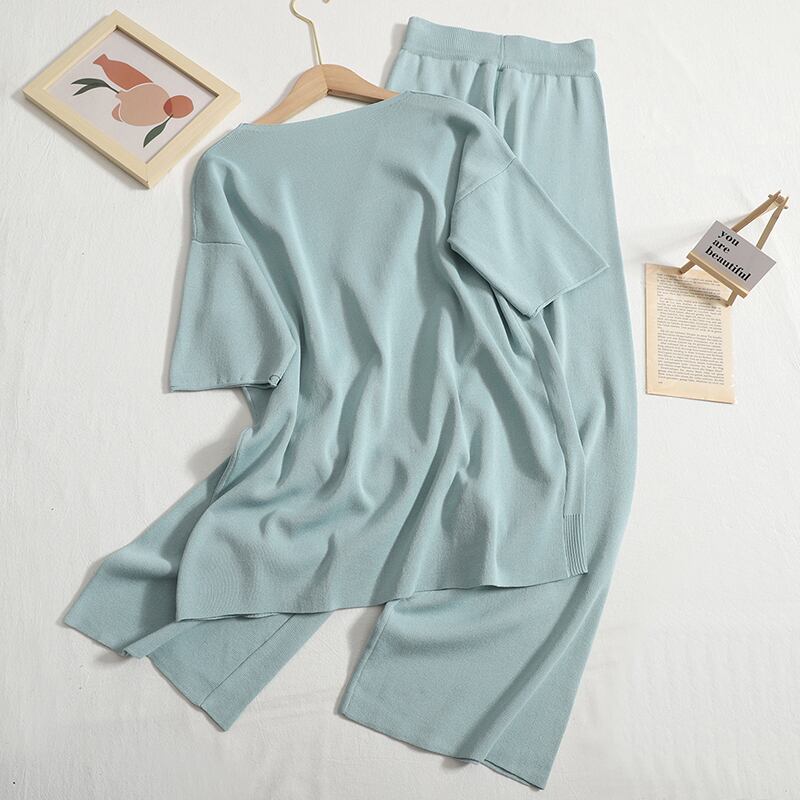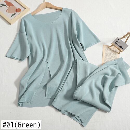 サマーツーピースニットセット半袖Oネックスプリットニット+Wiastワイドレッグパンツスーツ ショート ハーフスリーブ 夏物 ワイドパンツ kor34836337003