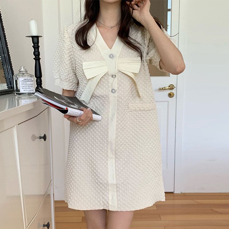 のみくまシックボウノットウーマンドレス2022サマーパフスリーブVネックワンピースコントラストカラーVestidosDe リボン 夏物 kor40883280680