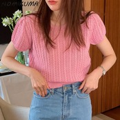 ノミクマシンツイスト半袖プルオーバーニットカジュアルOネックウーマンセーター2022サマースウィートニットトップス ショート ハーフスリーブ 大人ガーリー キュート 夏物 kor69465566723