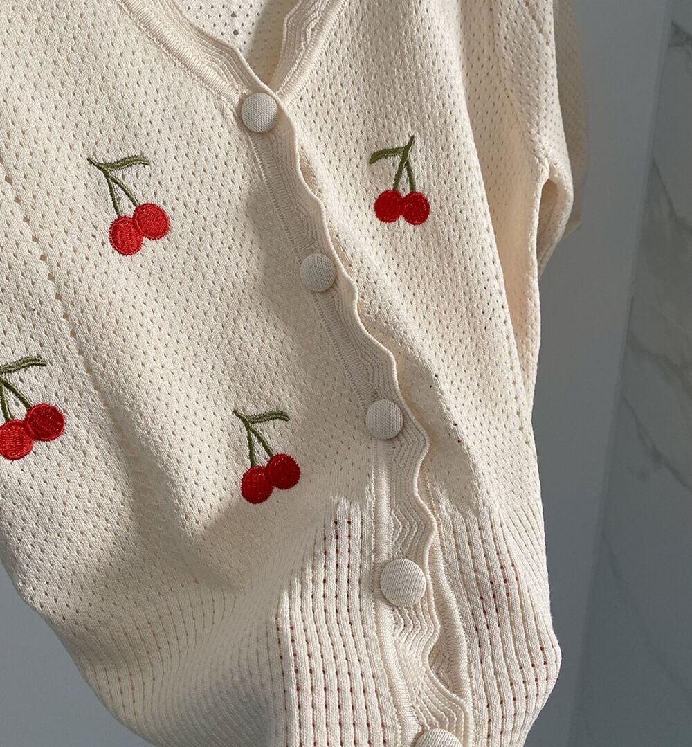 のみくまシック刺繍ホローアウトニットカーディガンレディースサマーニット2022パフスリーブVネックショートセーターコート 夏物 kor571469847