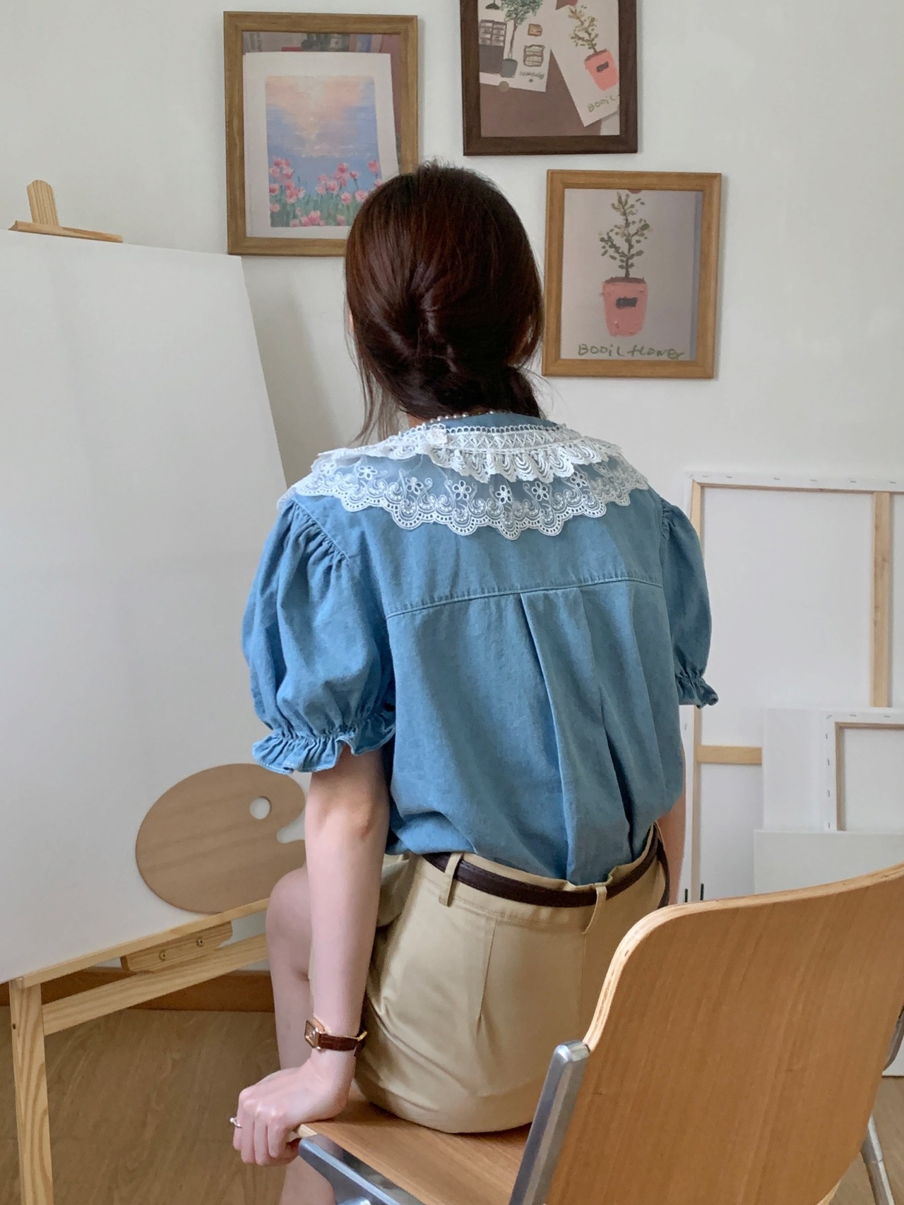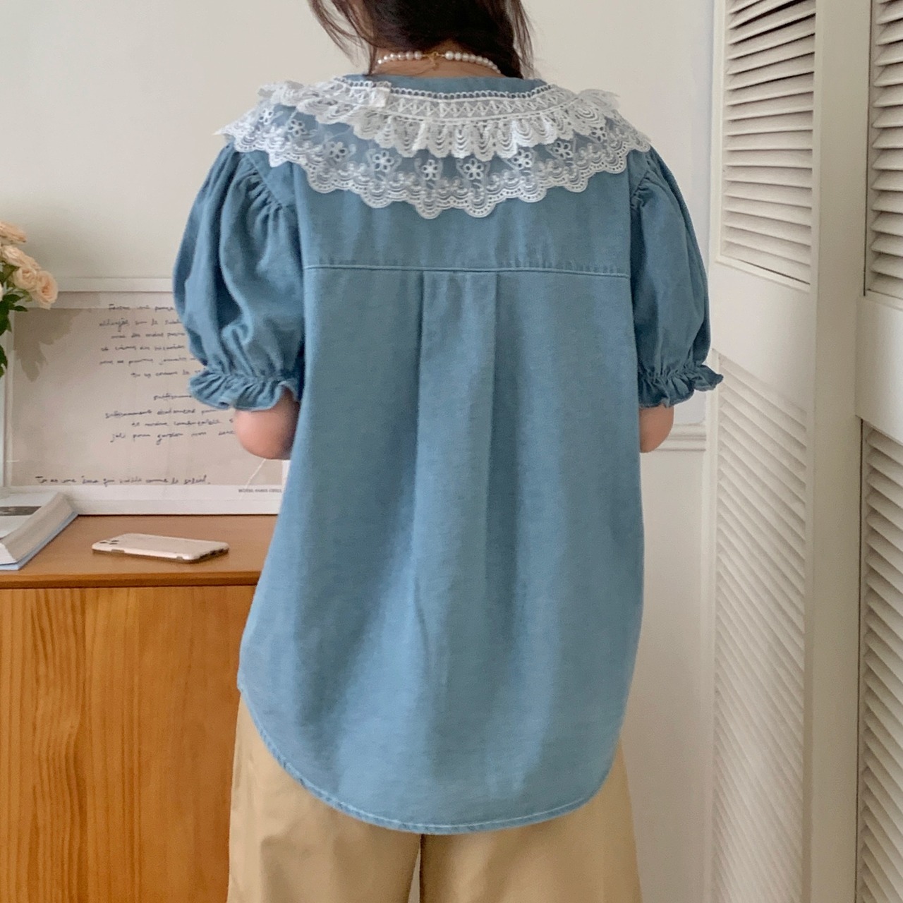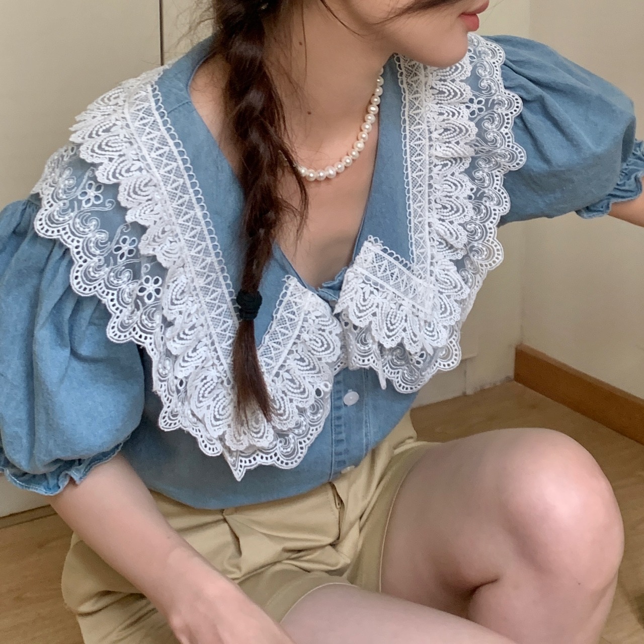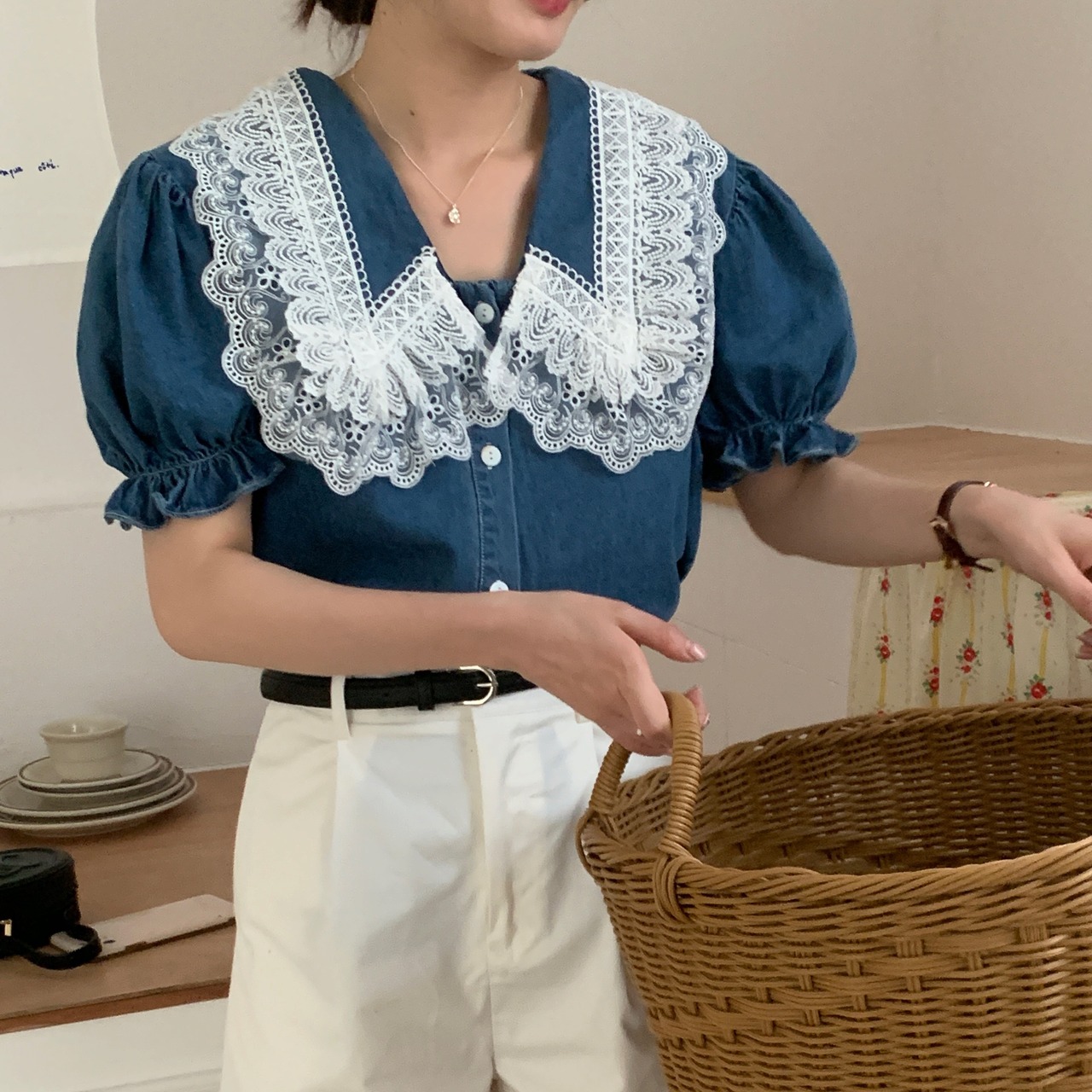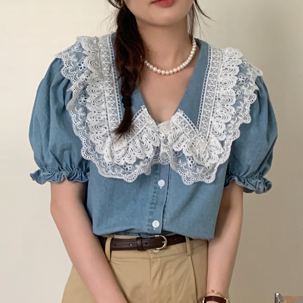 ノミクマシックレースパッチワークダブルピーターパンカラージャンブラウスコーザルパフスリーブ2022サマーカウボーイデミンシャツ 夏物 kor99776370468