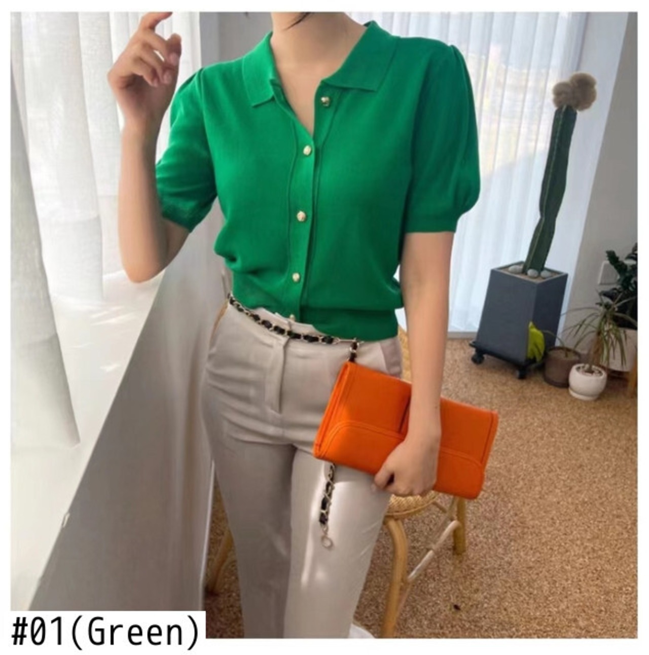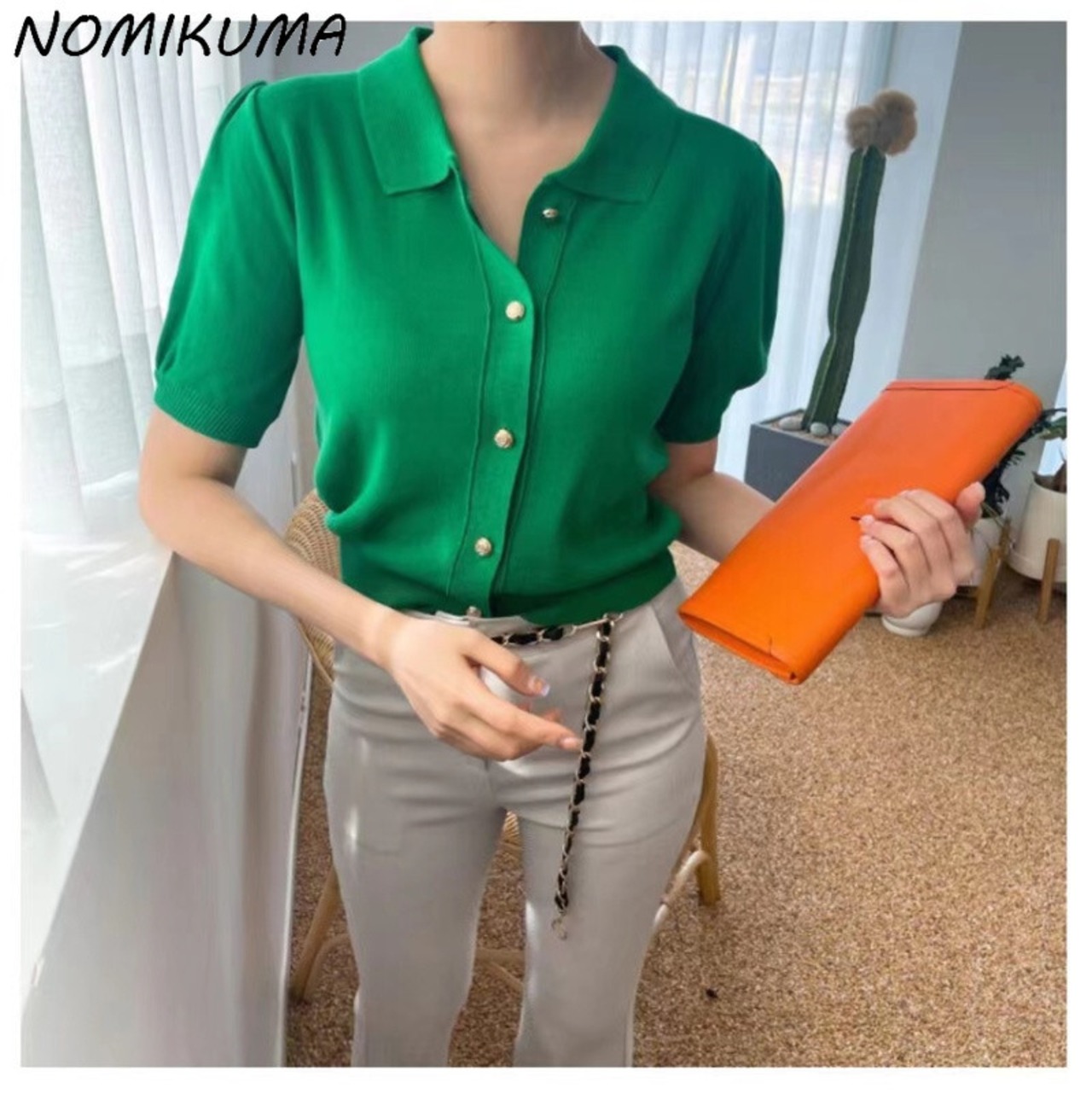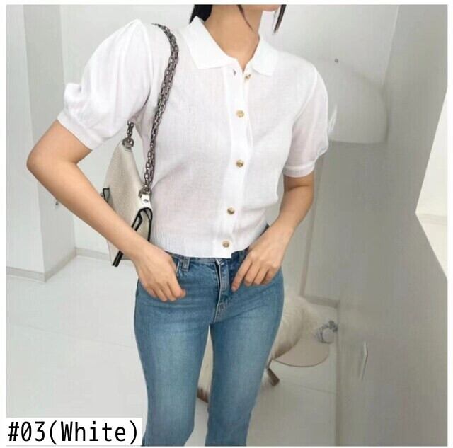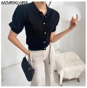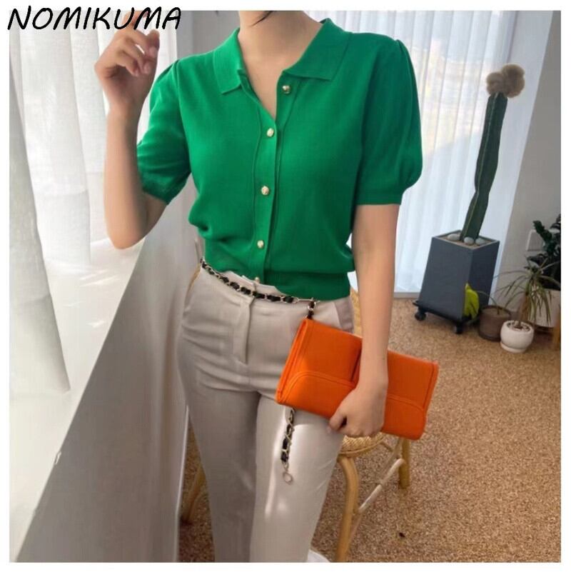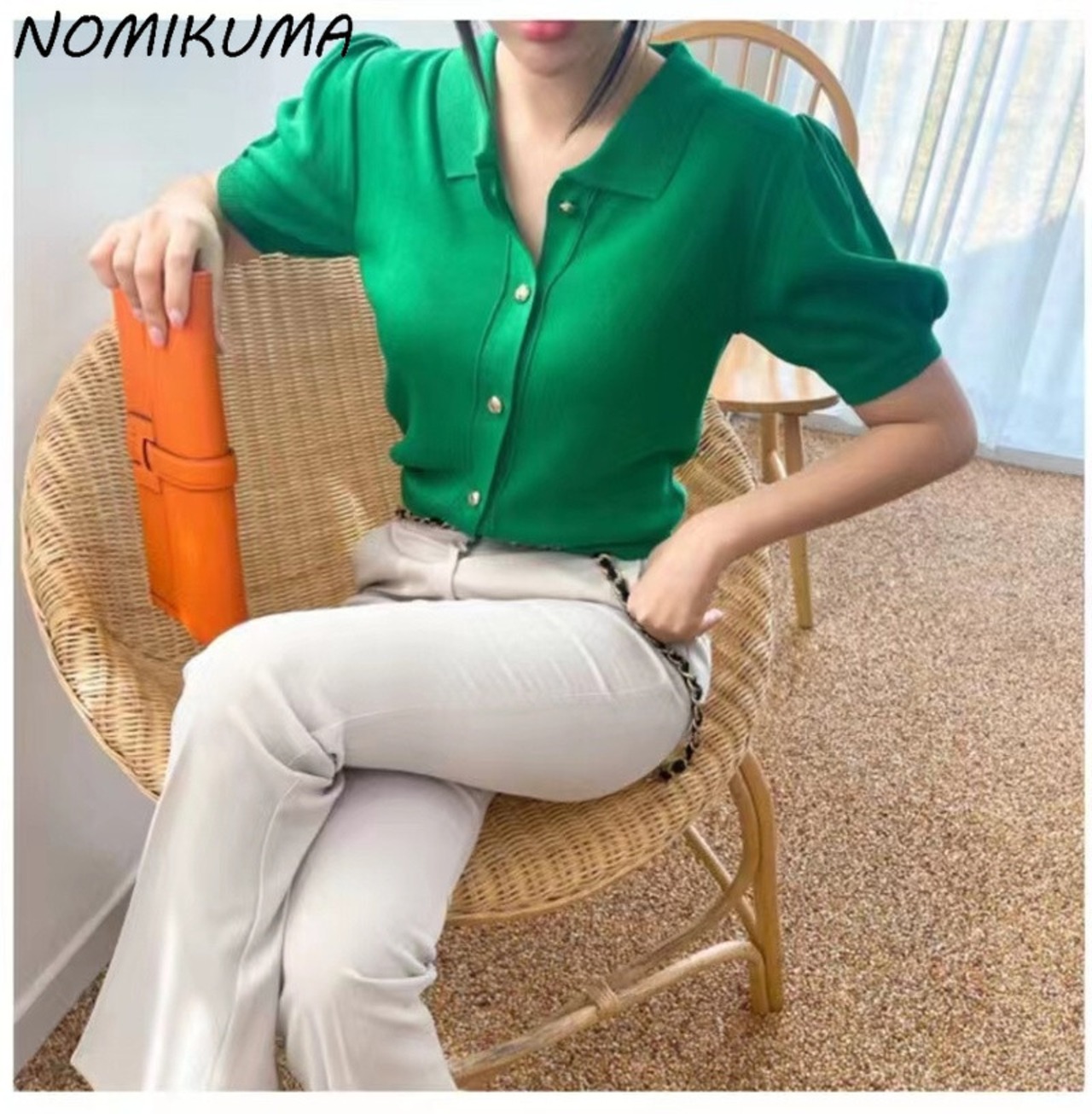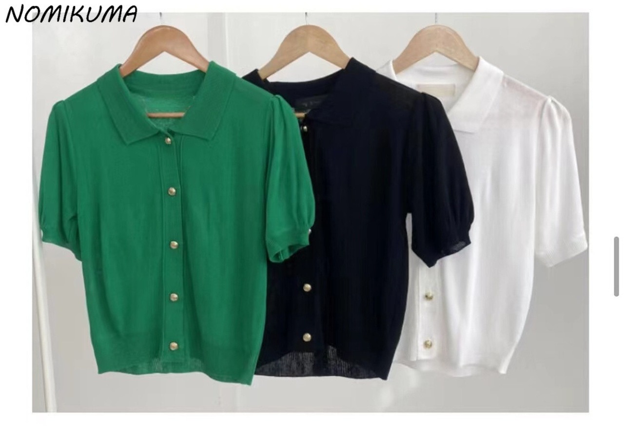 ノミクマ2022サマーニットレディースカーディガンシックパフスリーブターンダウンカラーセータートップスCausalSolidKnitwear Coat 夏物 ソリッドカラー kor33451651778