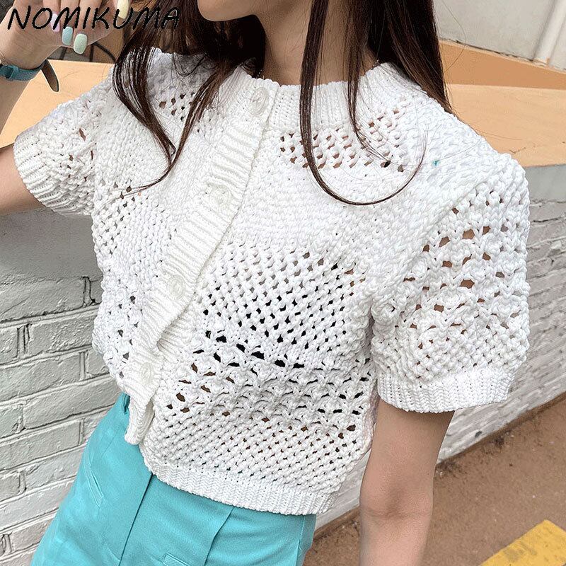 ノミクマシックサマースウィートパフスリーブニットカーディガンホローアウトOネックセーターコートCausal2022ニットトップス 大人ガーリー キュート カジュアル 夏物 kor64408178182