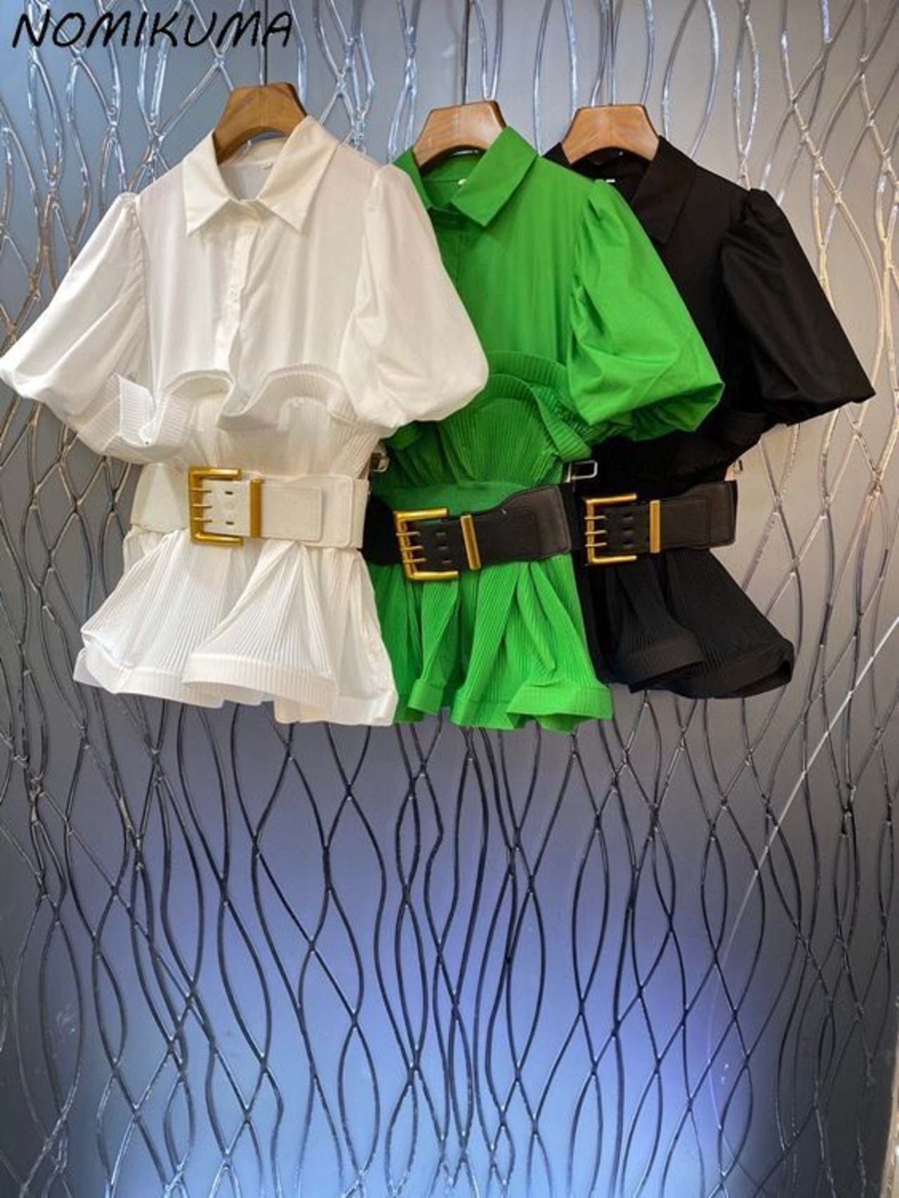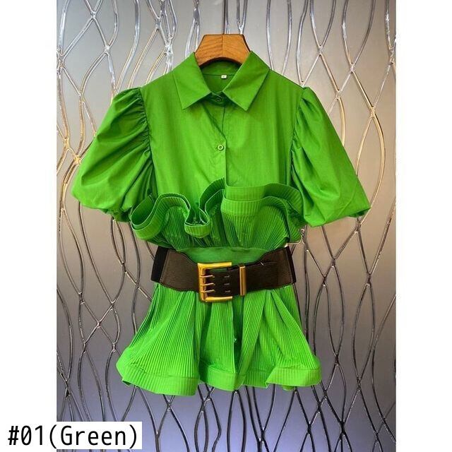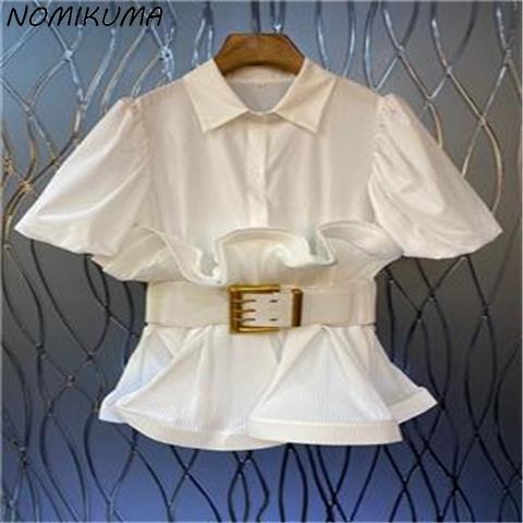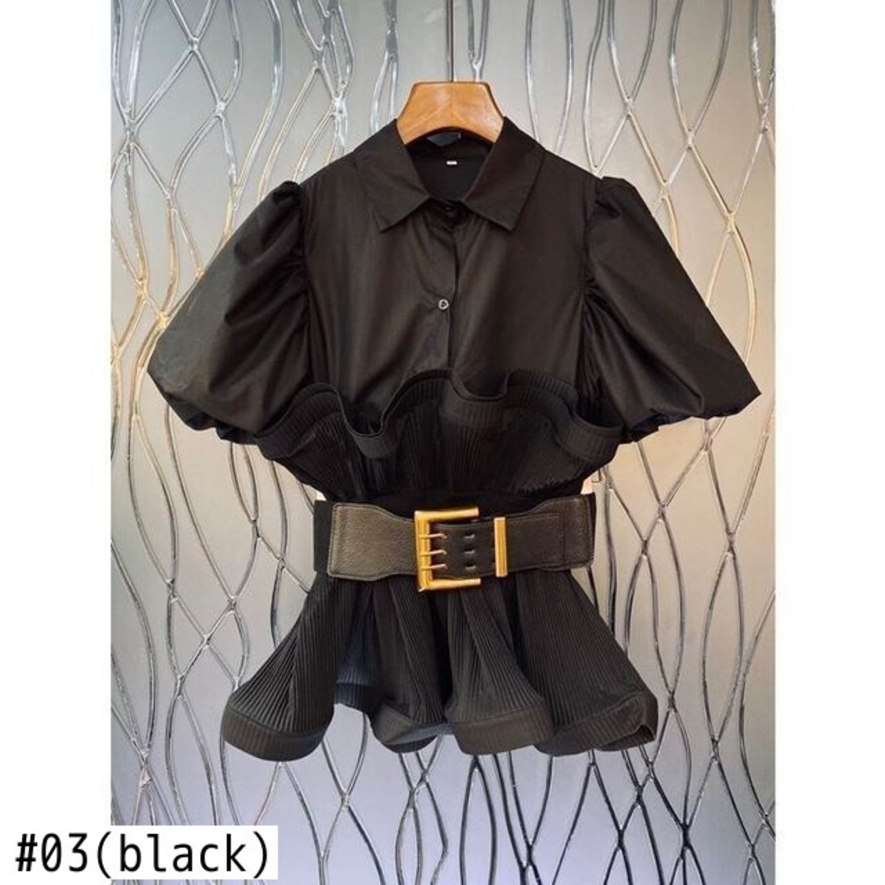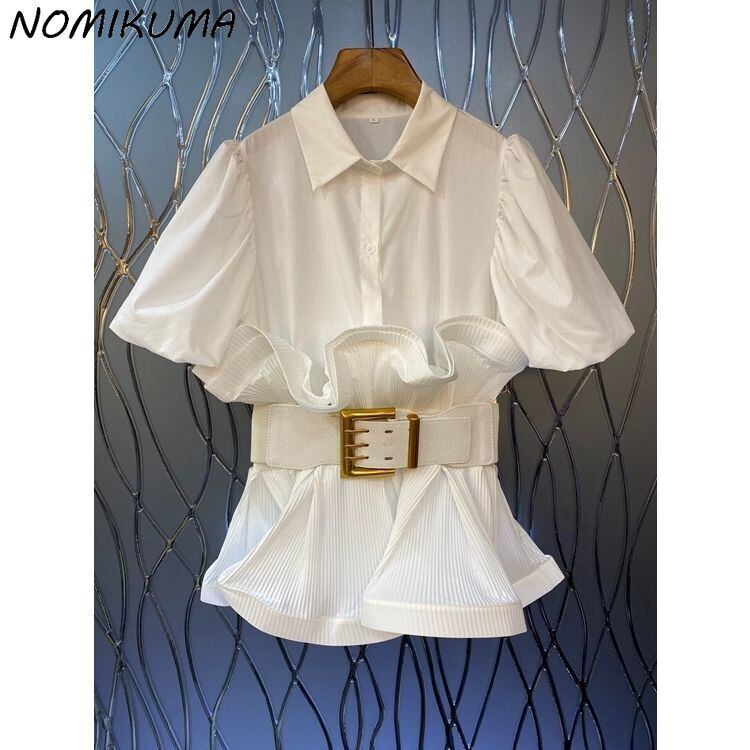 ノミクマ2022ブラウストップスランタンスリーブターンダウンカラーシャツベルトスリムウエストフリルパッチワーク ハーネス kor22941814729