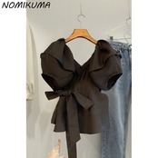 ノミクマ2022サマーパフスリーブウーマンドールシャツボウ包帯因果Vネックブラウストップシックソリッドフェミニマ リボン 夏物 ソリッドカラー kor89990473136