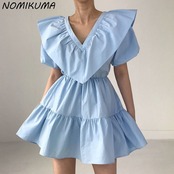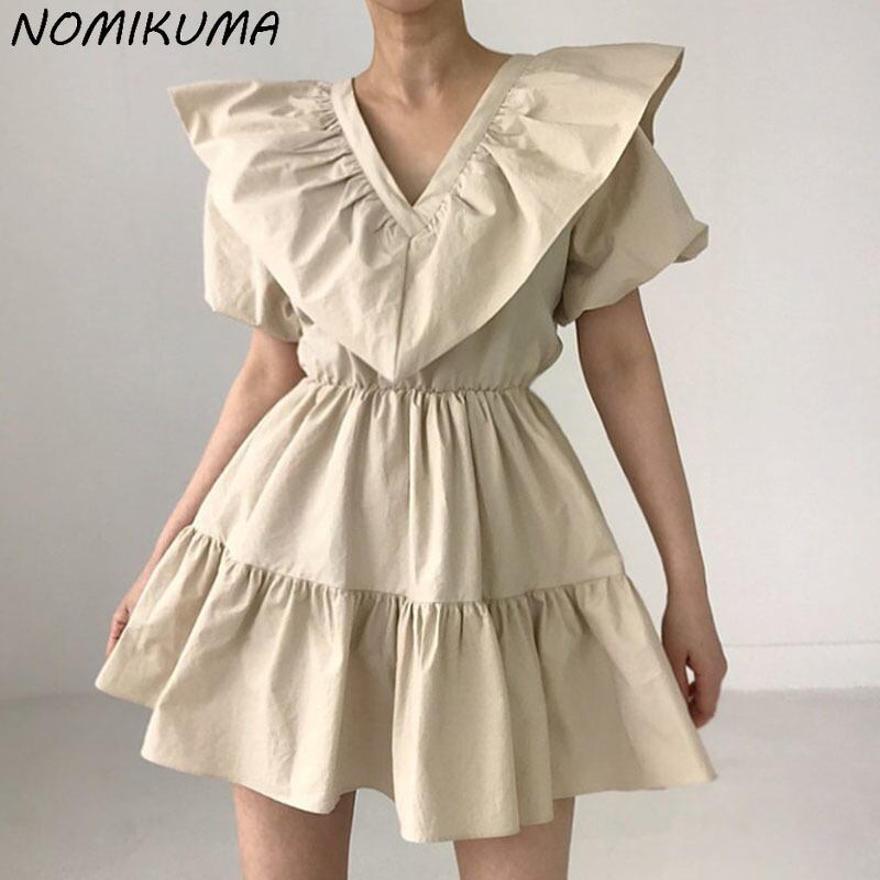 ノミクマシックサマーVネックウーマンドレスフリルパフLseeveVestidosウエストAラインミニワンピース 夏物 kor9040383347