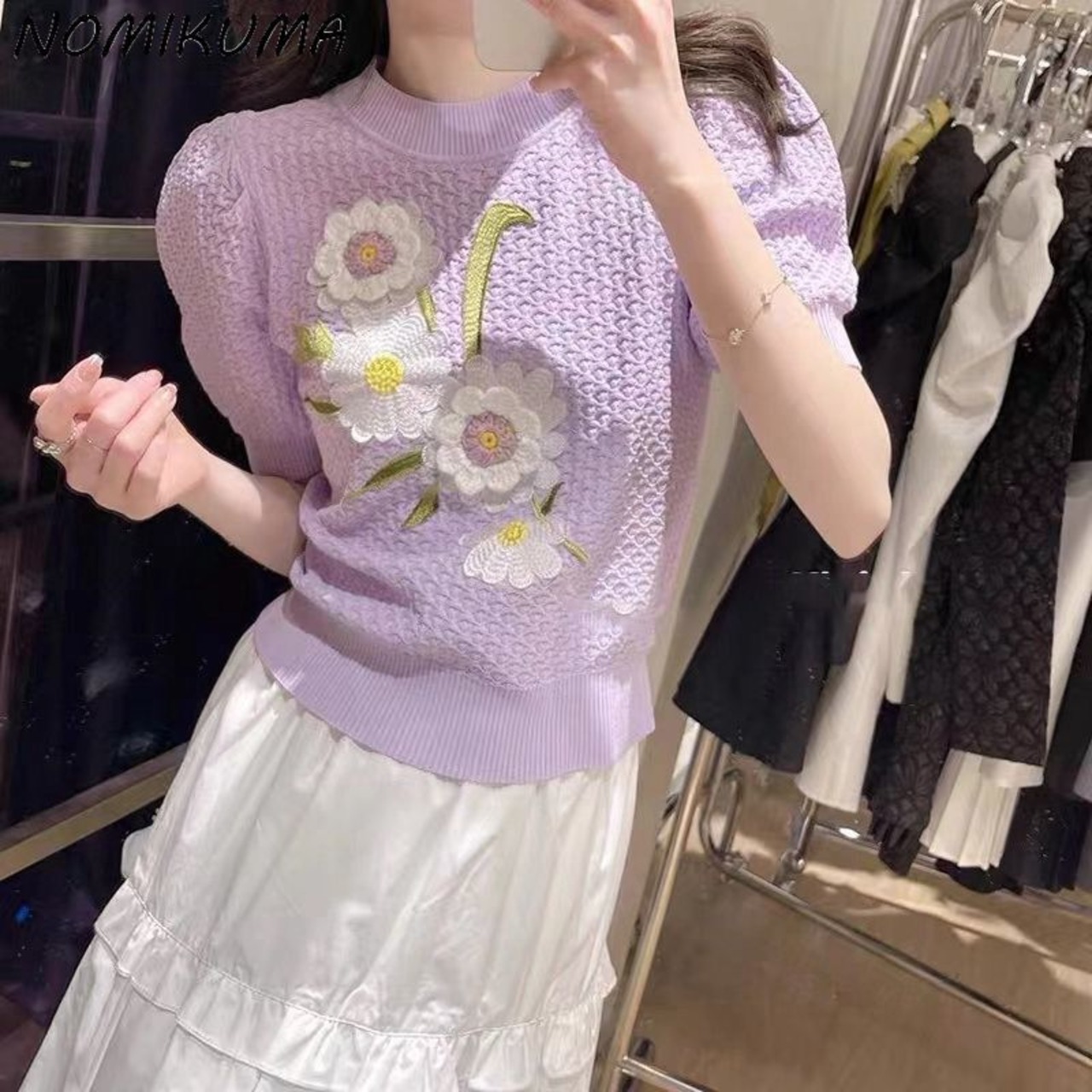 ノミクマ2022サマーパフスリーブショートニットトップスシックな3Dフラワープルオーバースウィートウーマンセータートップ 大人ガーリー キュート カジュアル 夏物 フラワーデザイン kor42164855225