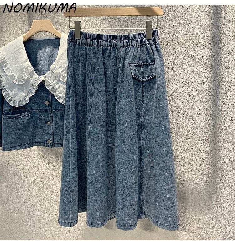 Nomikuma Demin 2Piece Outfits Women 2022 Summer Suits Peter Pan Collar Short Jeans Coat + Waist A-line Skirt Sets ショート サマー 夏物 スカート Aライン kor54527550305