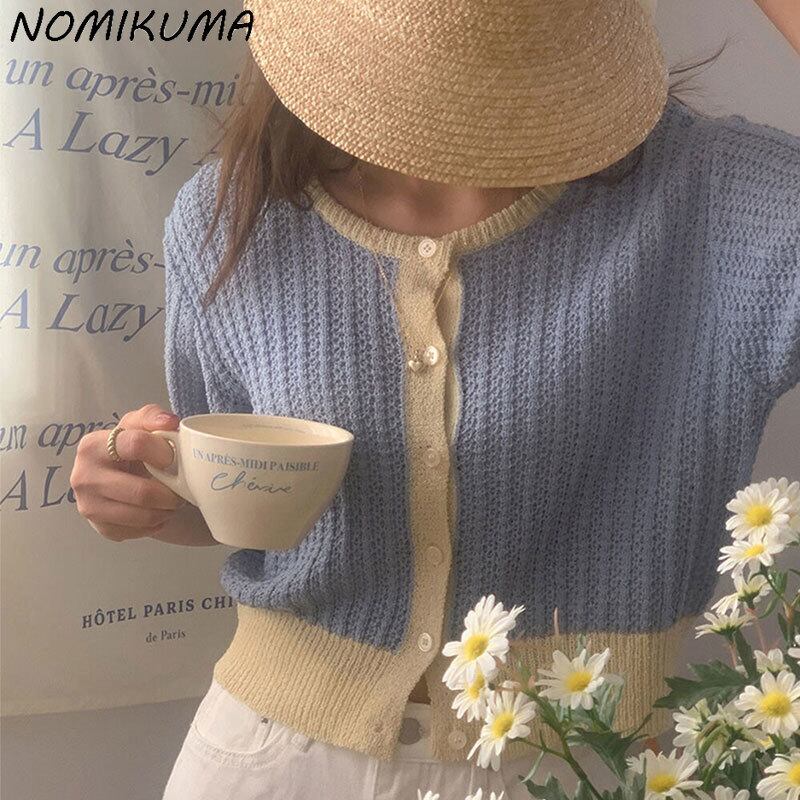 ノミクマカーディガンレディース半袖ヒットカラーOネックニット2022サマーシックシングルブレストニットセーターコート ショート ハーフスリーブ 夏物 kor24171676288
