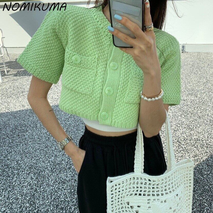 のみくまニットクロップカーディガンレディース2022夏半袖Oネックセーターコート因果シングルブレストニットトップス ショート ハーフスリーブ サマー 夏物 kor28056045051