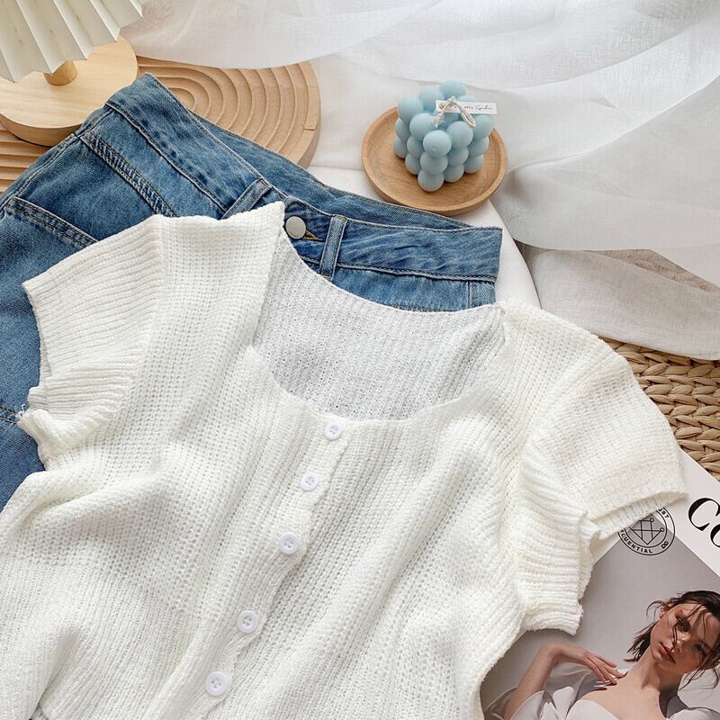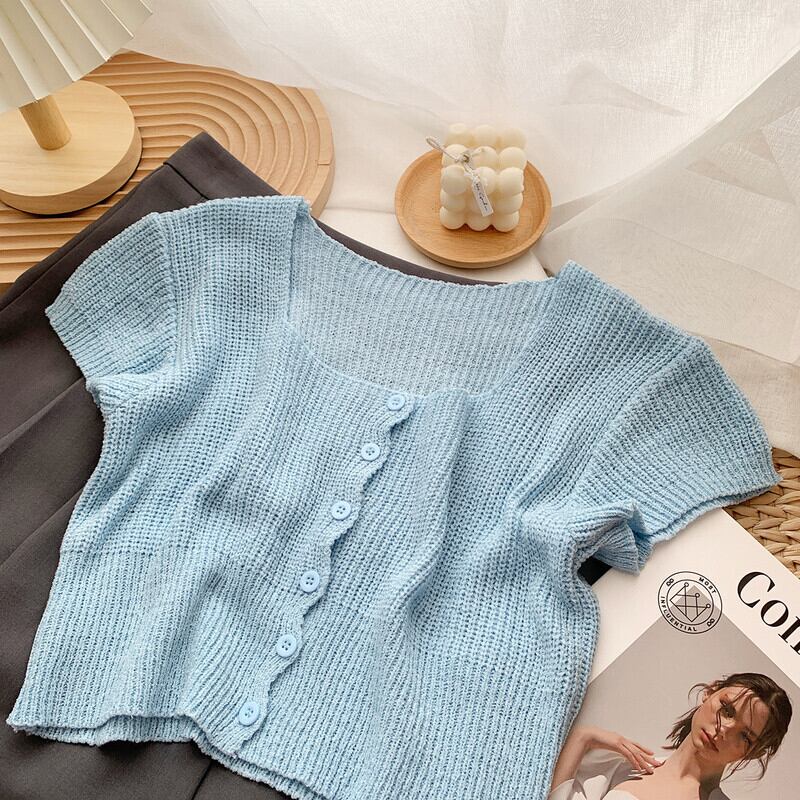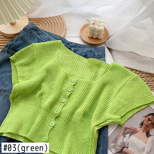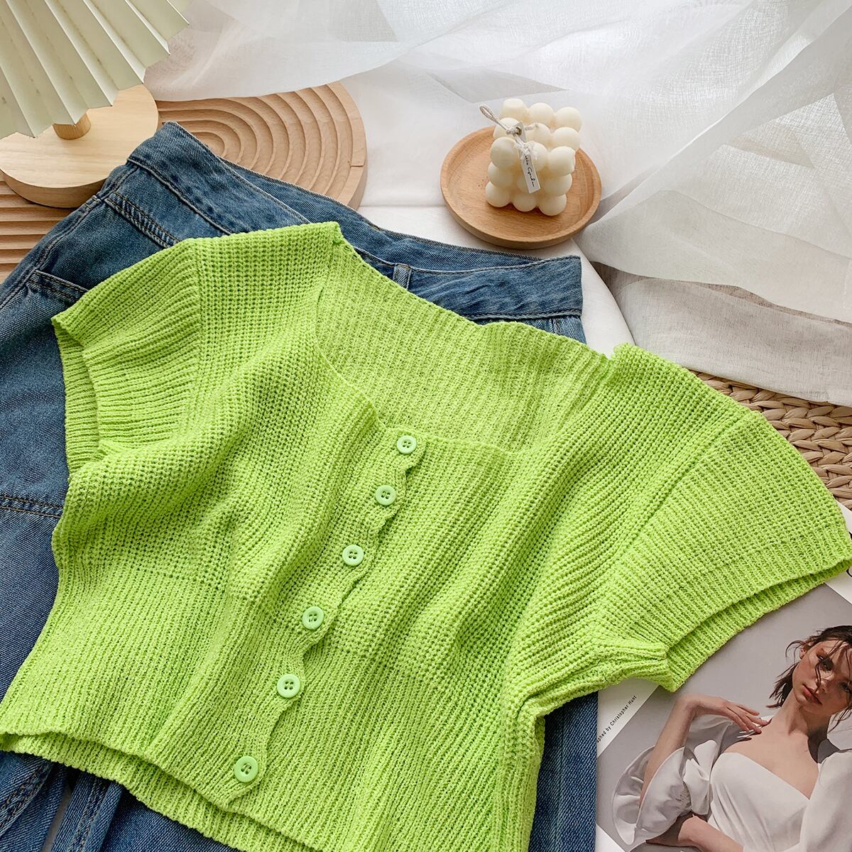ノミクマレディース半袖スクエアカラースリムクロップドニットカーディガン2022サマーシンソリッドストレッチトップニットコート ショート ハーフスリーブ 夏物 ソリッドカラー スクウェア kor70629276528