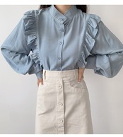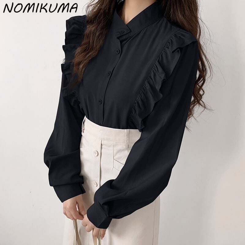 ノミクマ2022ブラウスレディースシックフリルスタンドネック長袖シャツCausalSolidDe Moda ロング ソリッドカラー kor67719231735
