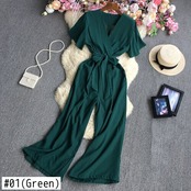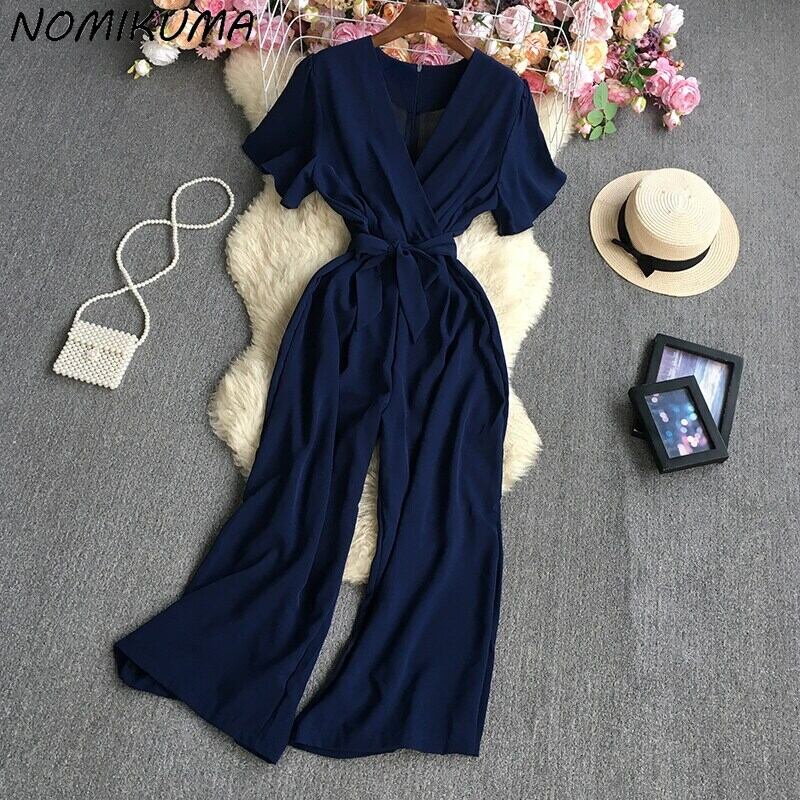 のみくまソリッド半袖女性ロンパースボウ包帯シムウエストジャンプスーツ2022夏Vネックワイドレッグボディスーツ ショート リボン ハーフスリーブ サマー 夏物 ワイドパンツ ソリッドカラー kor91388324104