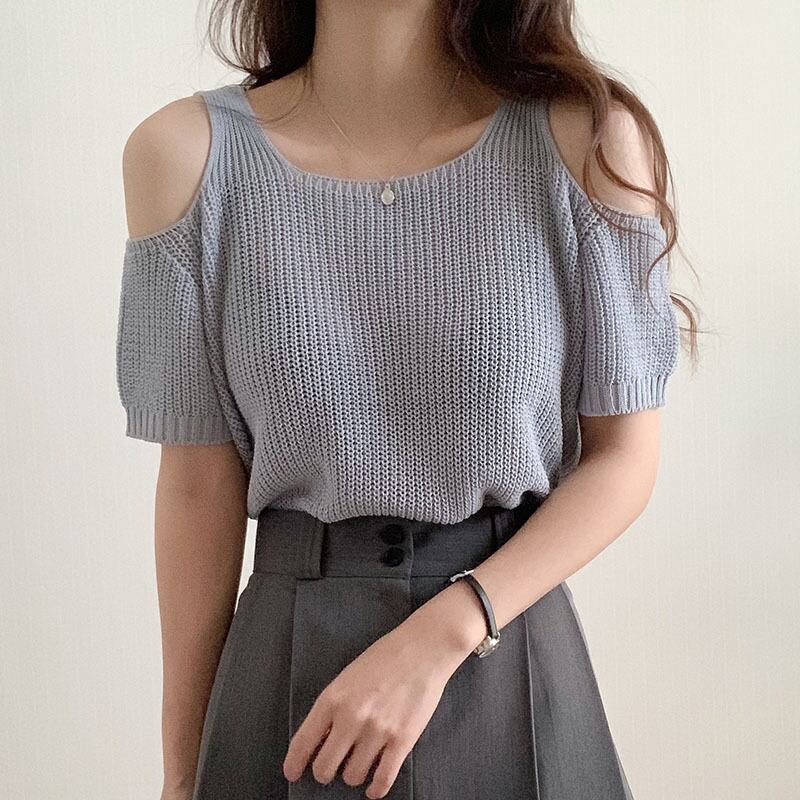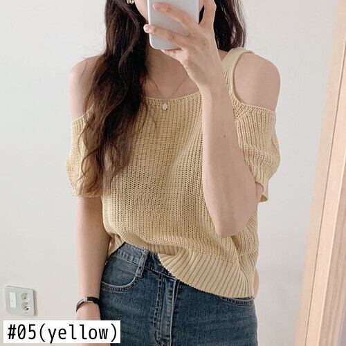 ノミクマホローアウトストラップレス半袖ニットカジュアルOネックレディースプルオーバー2022サマーシックニットトップス ショート ハーフスリーブ 夏物 kor4078767309