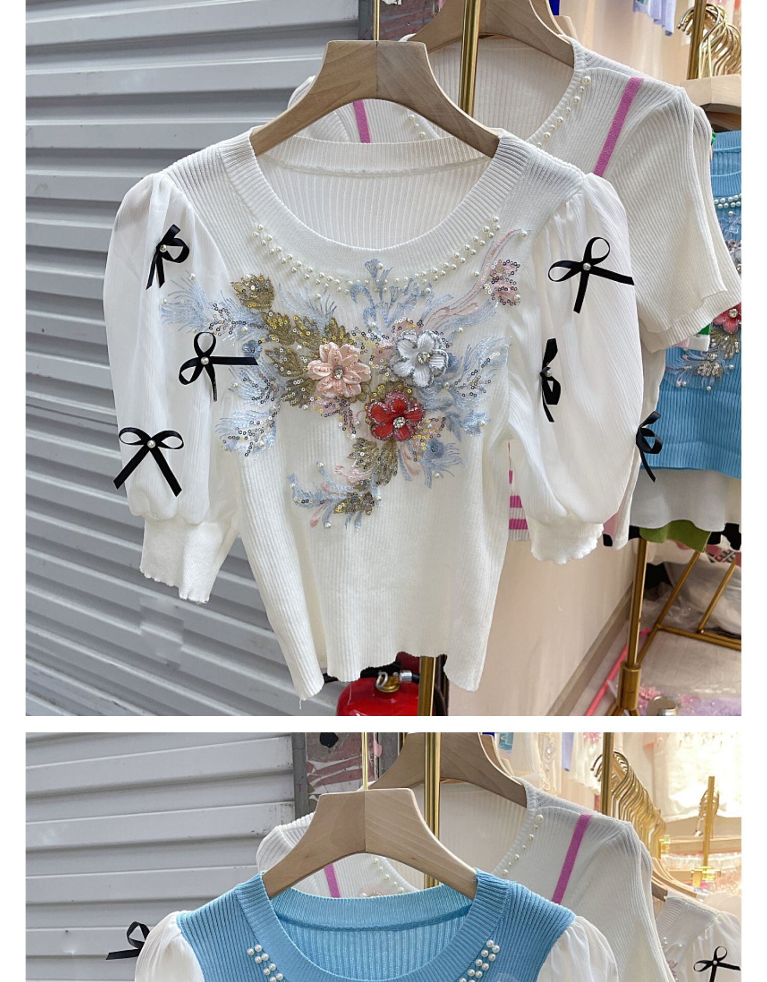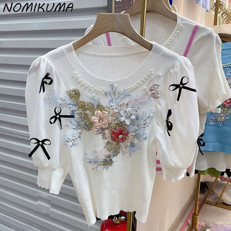 のみくまシック3Dスパンコールフラワービーズニットトップス2022夏の女性プルオーバー原因シフォンパフスリーブニット サマー 夏物 フラワーデザイン kor55730261129