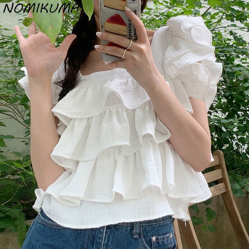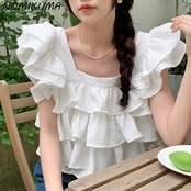 のみくまシックフライングスリーブレディーストップスレイヤードフリルスウィートブラウスシャツ2022サマースクエアカラーデ 大人ガーリー キュート カジュアル 夏物 スクウェア kor33781861942