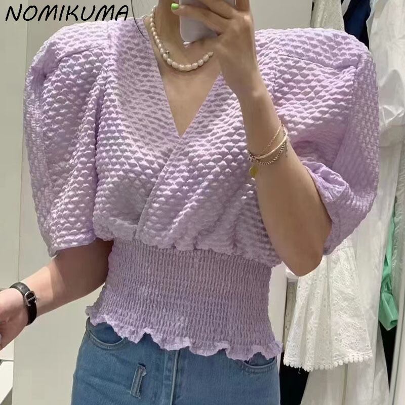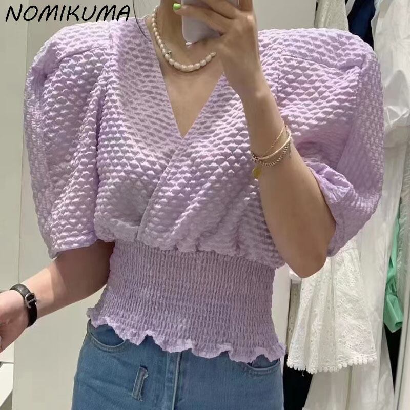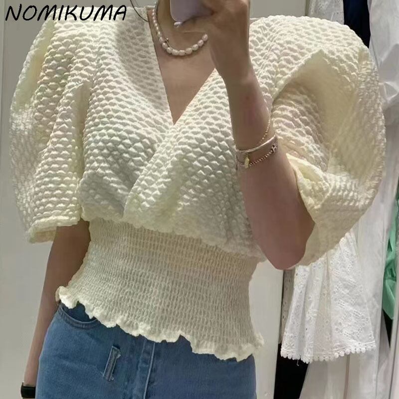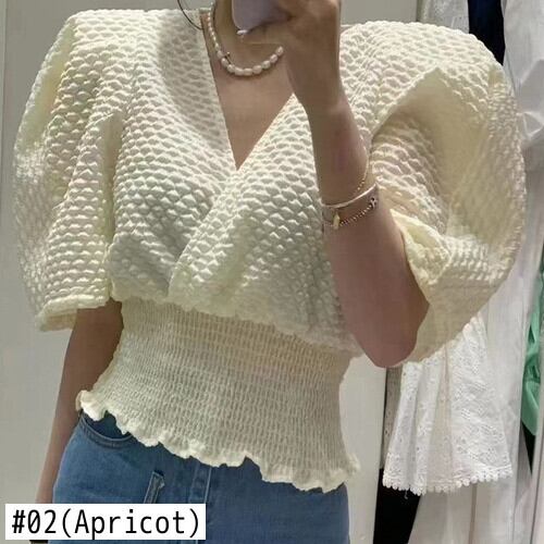 のみくまVネックパフスリーブブラウスレディーススリムウエストショートシャツ2022サマープルオーバーデ 夏物 kor34306614771