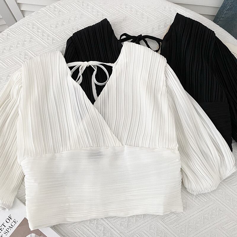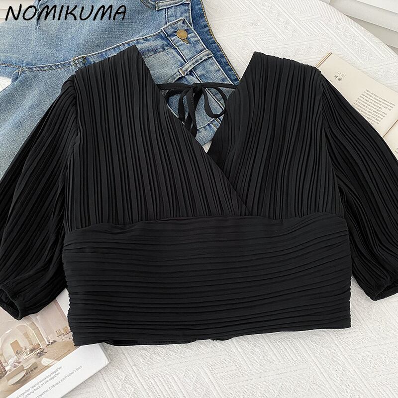 ノミクマショートシフォンブラウスバンデージバックレスフォールドパフスリーブシャツレディース2022サマーVネックトップ 夏物 kor51517175028