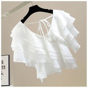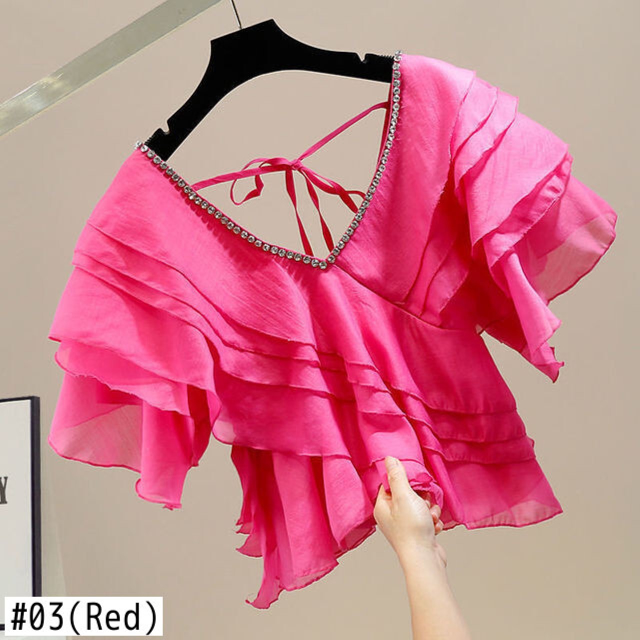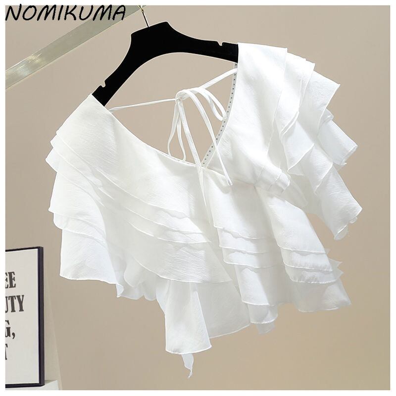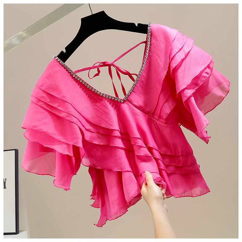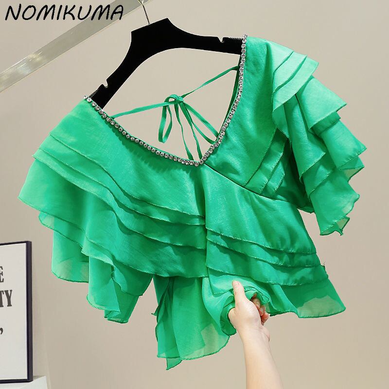 ノミクマダイヤモンドVネックフリルブラウスレディース2022サマーレディーストップスカジュアルスウィートシックスタイルシャツ 大人ガーリー キュート 夏物 kor53084878395