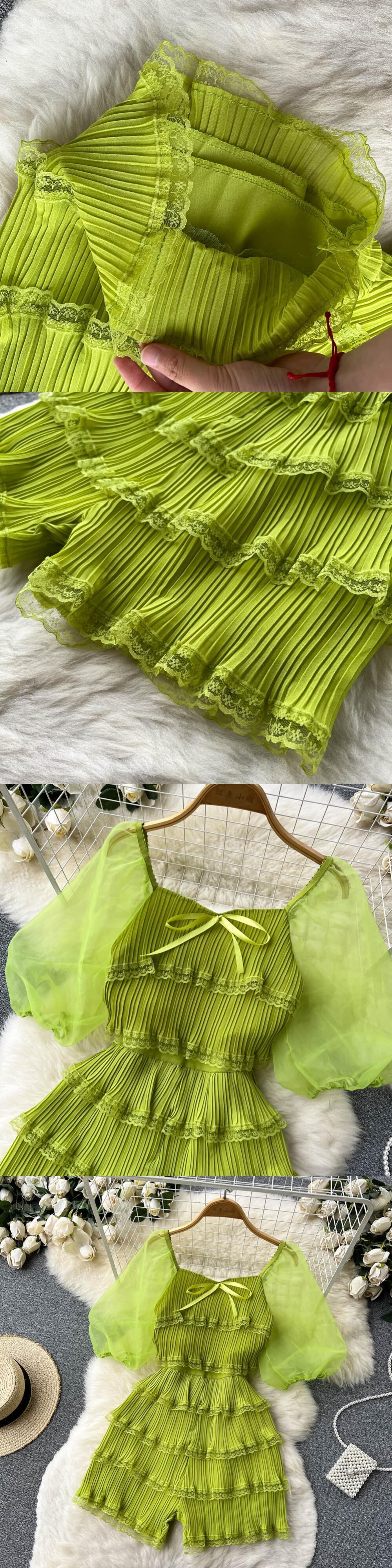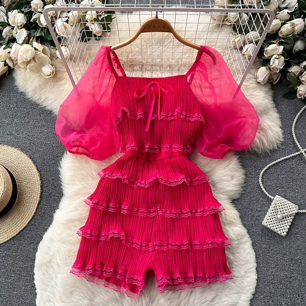 ノミクマボディスーツスクエアカラーメッシュパフスリーブフォールドレディースロンパース2022サマーシックレイヤードフリルワイドレッグプレイスーツ 夏物 ワイドパンツ スクウェア kor59071390121