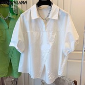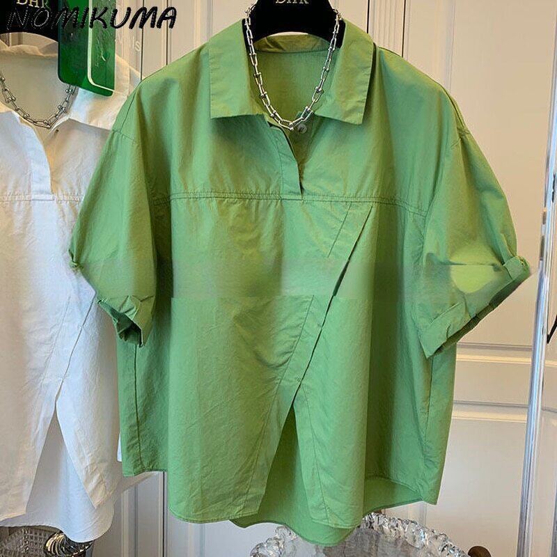 NomikumaIrregularVinatge半袖ブラウス女性2022年夏の因果ターンダウンカラーソリッドトップシャツ ショート ハーフスリーブ サマー 夏物 ソリッドカラー kor6203731031