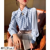のみくまストライプレディーストップスシックボウノットターンダウンコラールパフ長袖シャツ2022年秋De ロング リボン オータム 秋物 kor49521874176