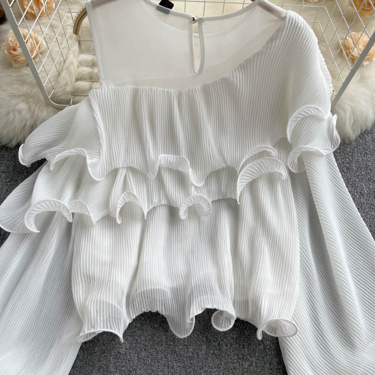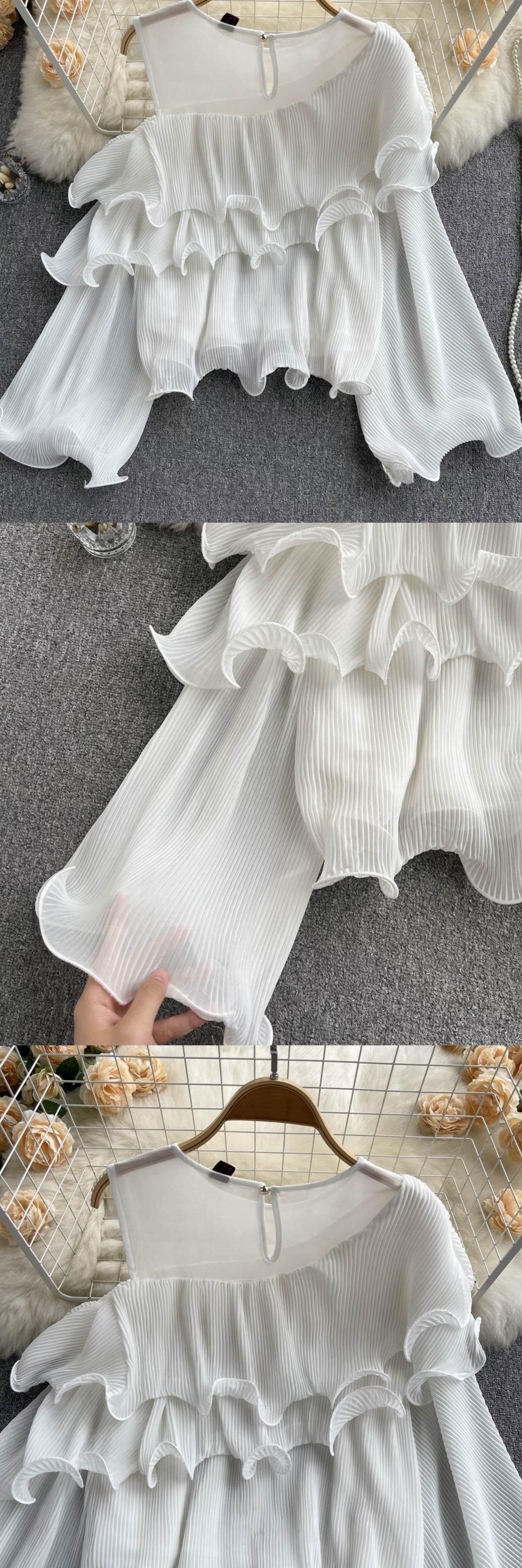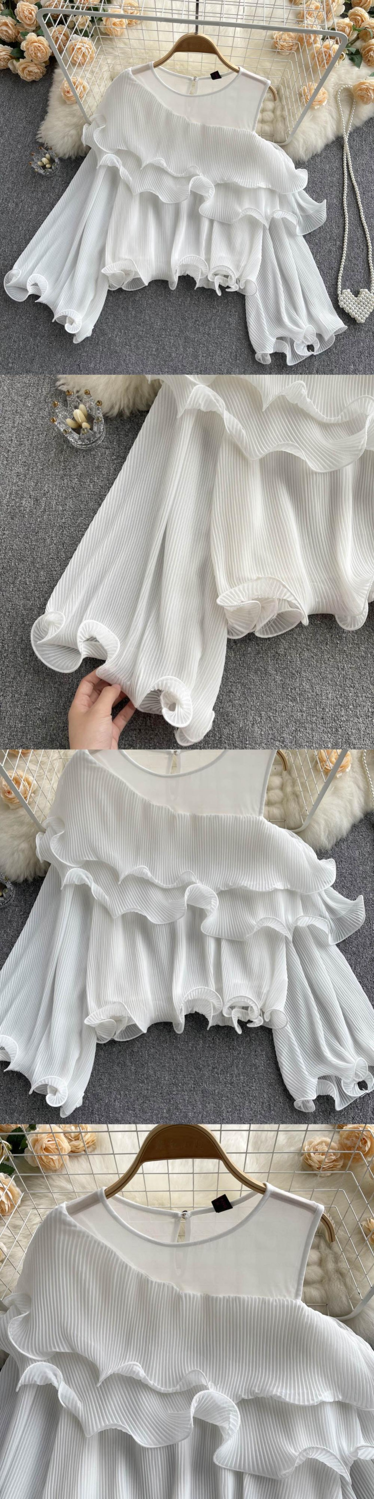 のみくまストラップレス長袖Oネックプルオーバートップブラウスカジュアルフォールドフリルウーマンシャツ2022秋 ロング オータム 秋物 kor15441901375