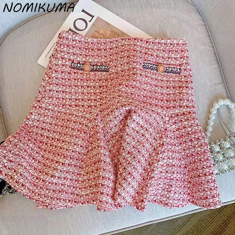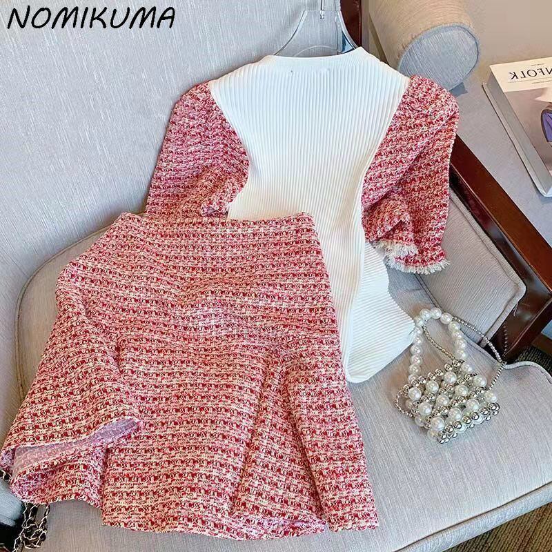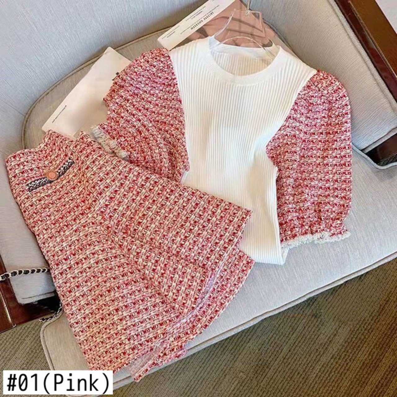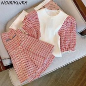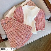 のみくまパッチワークセットレディースパフスリーブOネックプルオーバーニットトップス+ウエストカジュアルAラインスカート2枚 kor75746264127