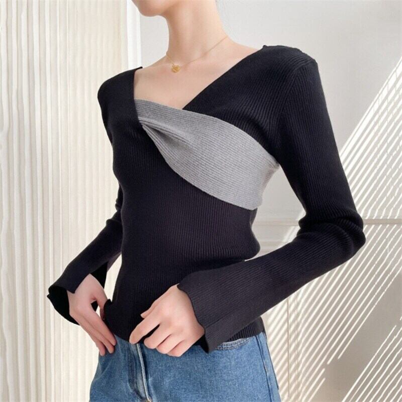 ノミクマヒットカラーイレギュラーストラップレスプルオーバーセーター2022秋冬ベーシックニットロングスリーブスリムニットトップス 長袖 オータム 秋物 ウィンター 冬物 kor15838795294