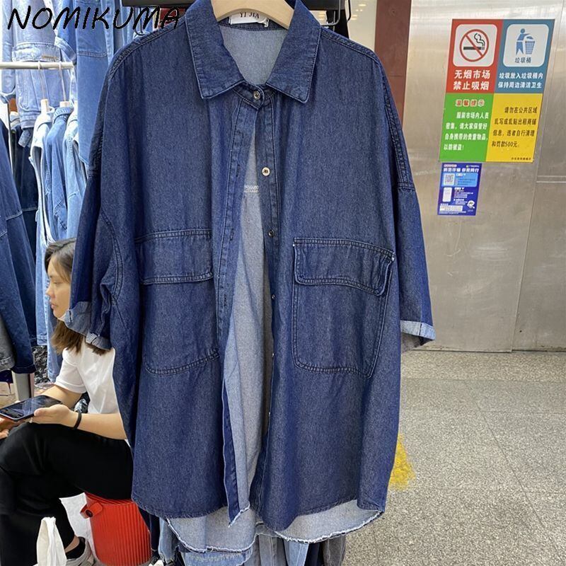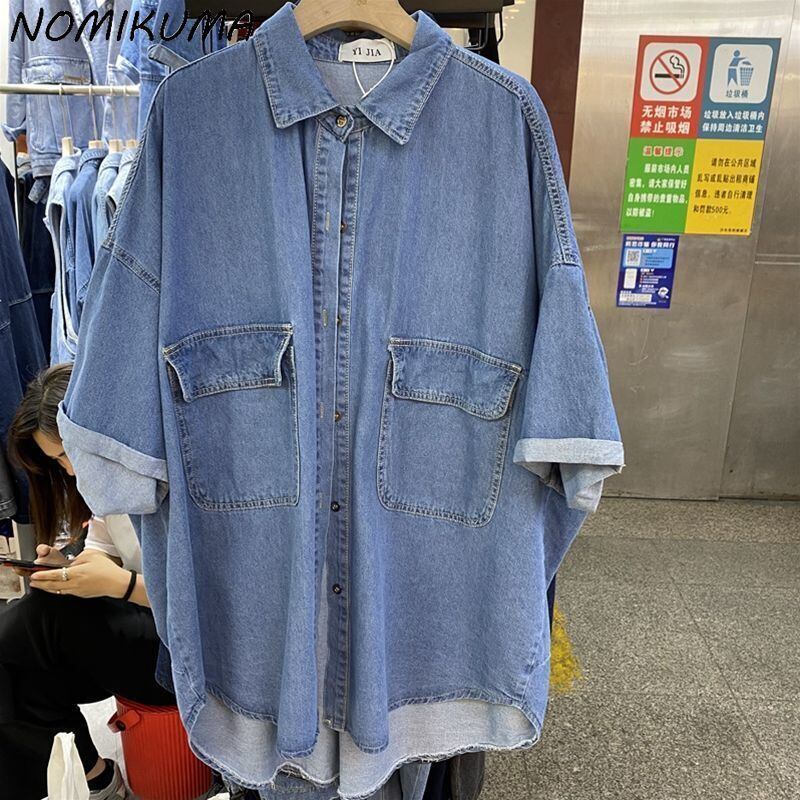 Nomikuma Koeran CausalPocketsDemin半袖ブラウス2022SummerTop De Moda Half Women Jeans Shirt ショート ハーフスリーブ サマー 夏物 kor26097438194