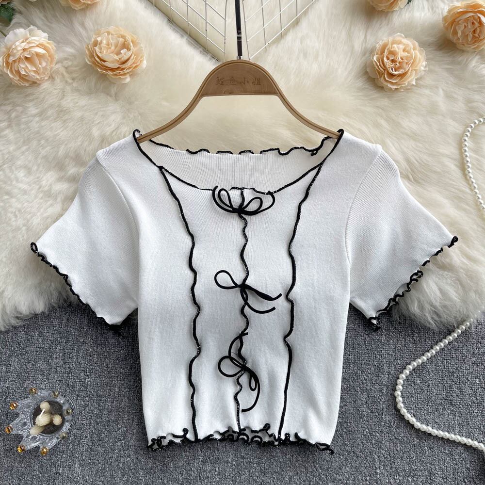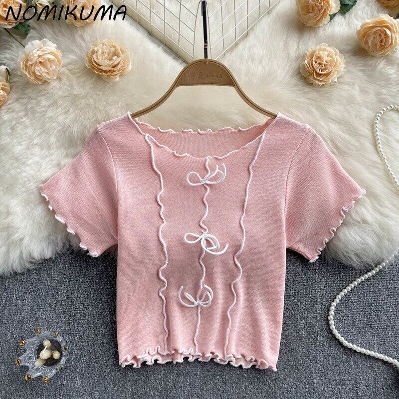 のみくまスウィートヒットカラー蝶ネクタイスリムショートニットスリーブOネックニットトップス2022サマーシックプルオーバー リボン 大人ガーリー キュート カジュアル 夏物 kor26790859406