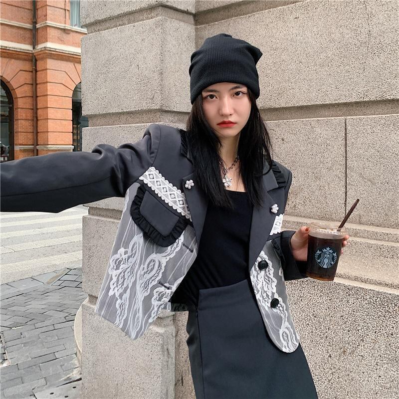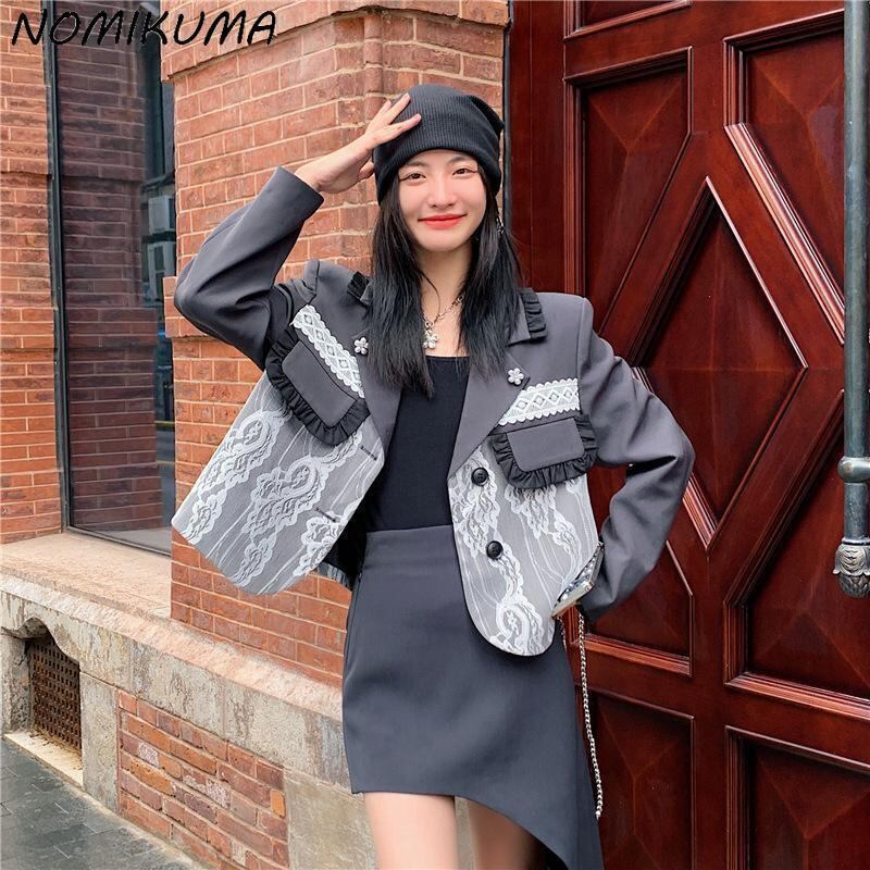 レースパッチワークブレザーコートカジュアルブレザー女性2022長袖ノッチ付きカラースーツジャケット6N748 ロング kor82265300338