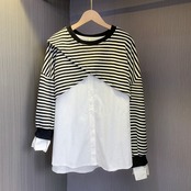 ノミクマ2022秋の女性スウェットシャツストライプパッチワーク長袖プルオーバー原因Oネックパーカートップ ロング オータム 秋物 kor77195731345